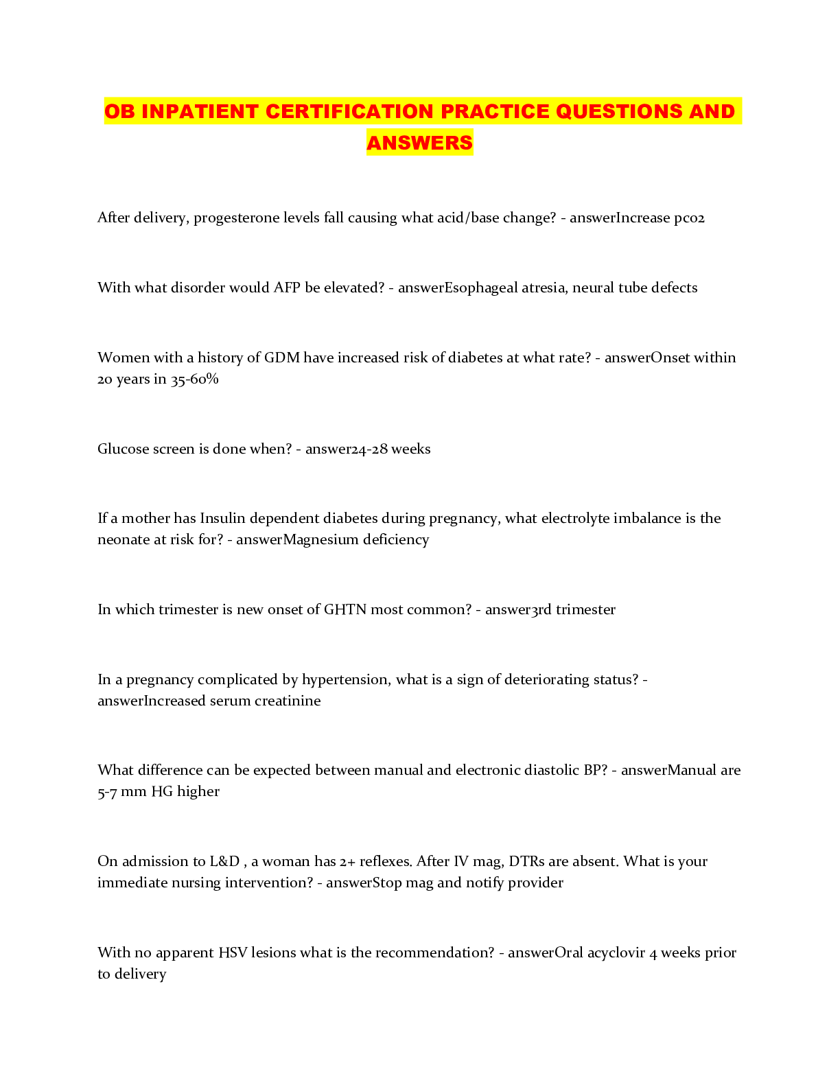 Nephrology > QUESTIONS & ANSWERS > OB INPATIENT CERTIFICATION PRACTICE QUESTIONS AND ANSWERS (All)
