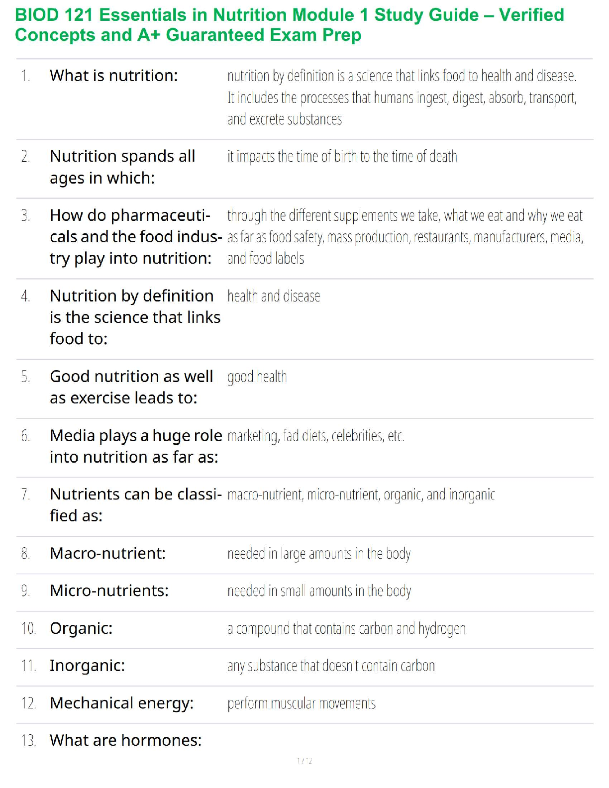 Nutrition > STUDY GUIDE > BIOD 121 Essentials in Nutrition Module 1 Study Guide – Verified Concepts and A+ Guaranteed Exam Prep (All)