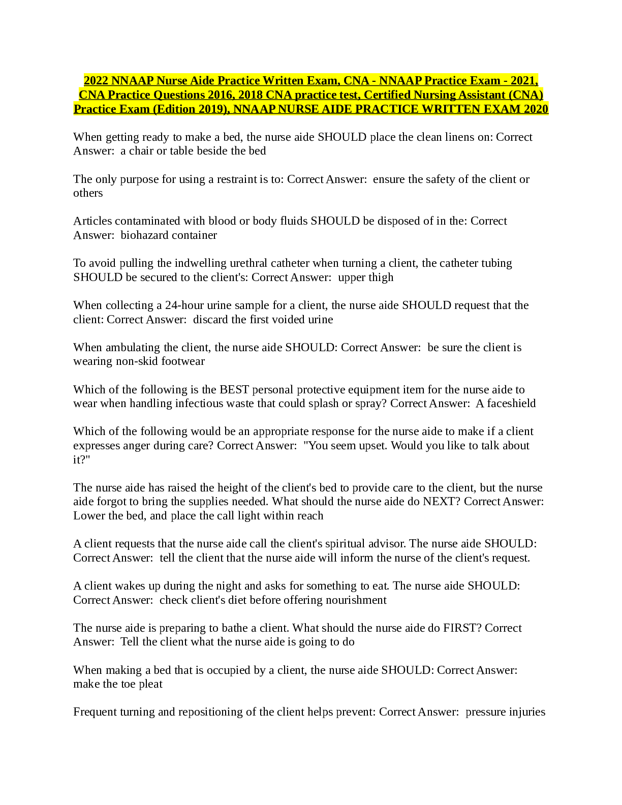 Nutrition > EXAM > 2022_NNAAP_Nurse_Aide_Practice_Written_Exam (All)
