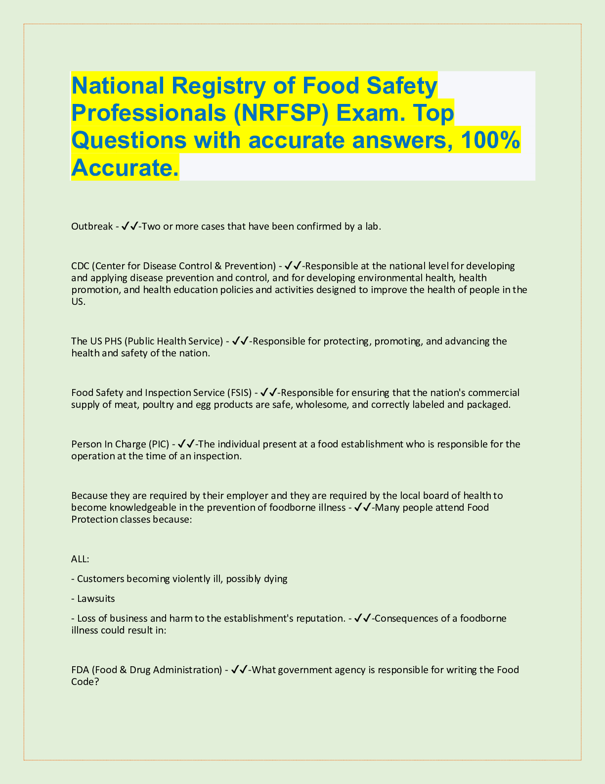 Nutrition > QUESTIONS & ANSWERS > National Registry of Food Safety Professionals (NRFSP) Exam. Top Questions with accurate answers, 100% (All)