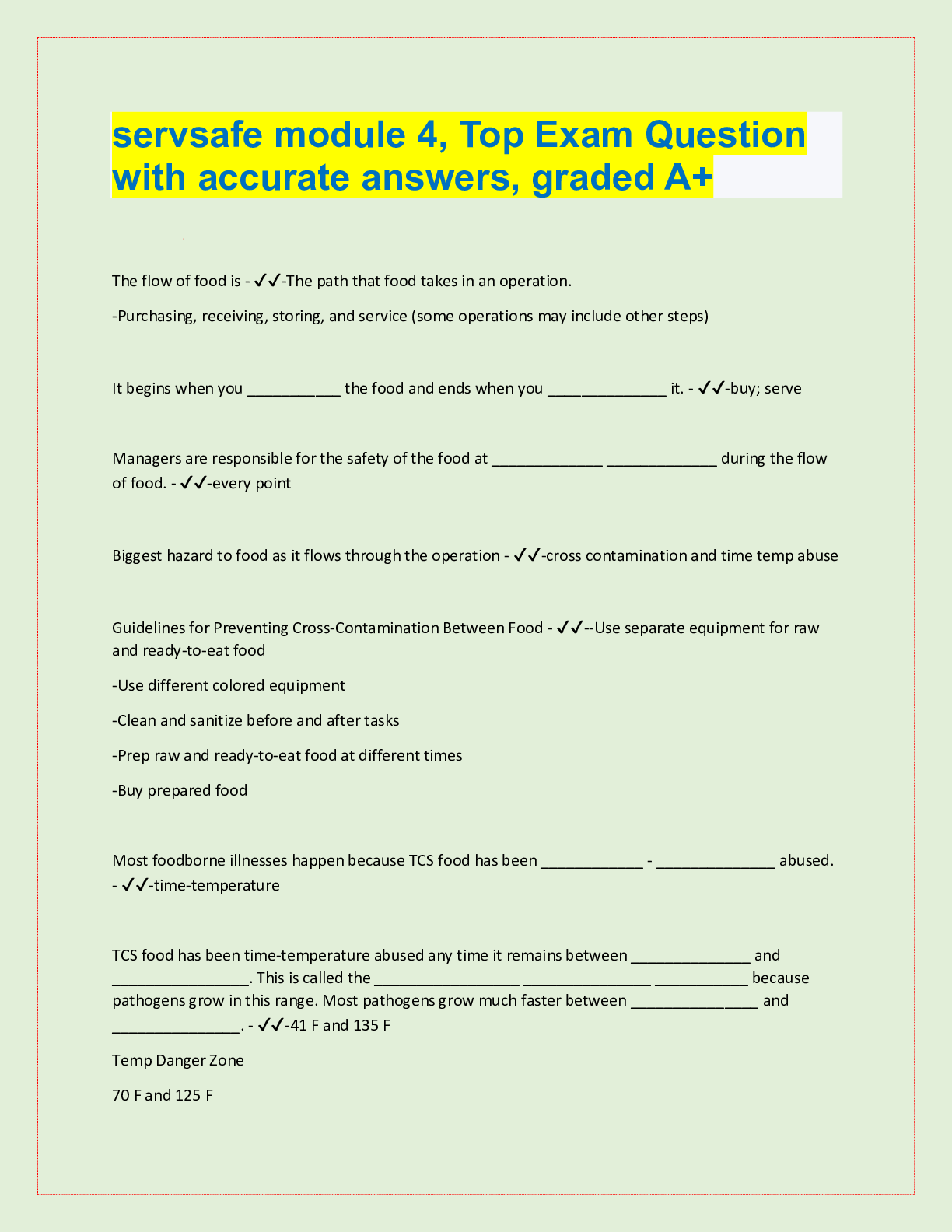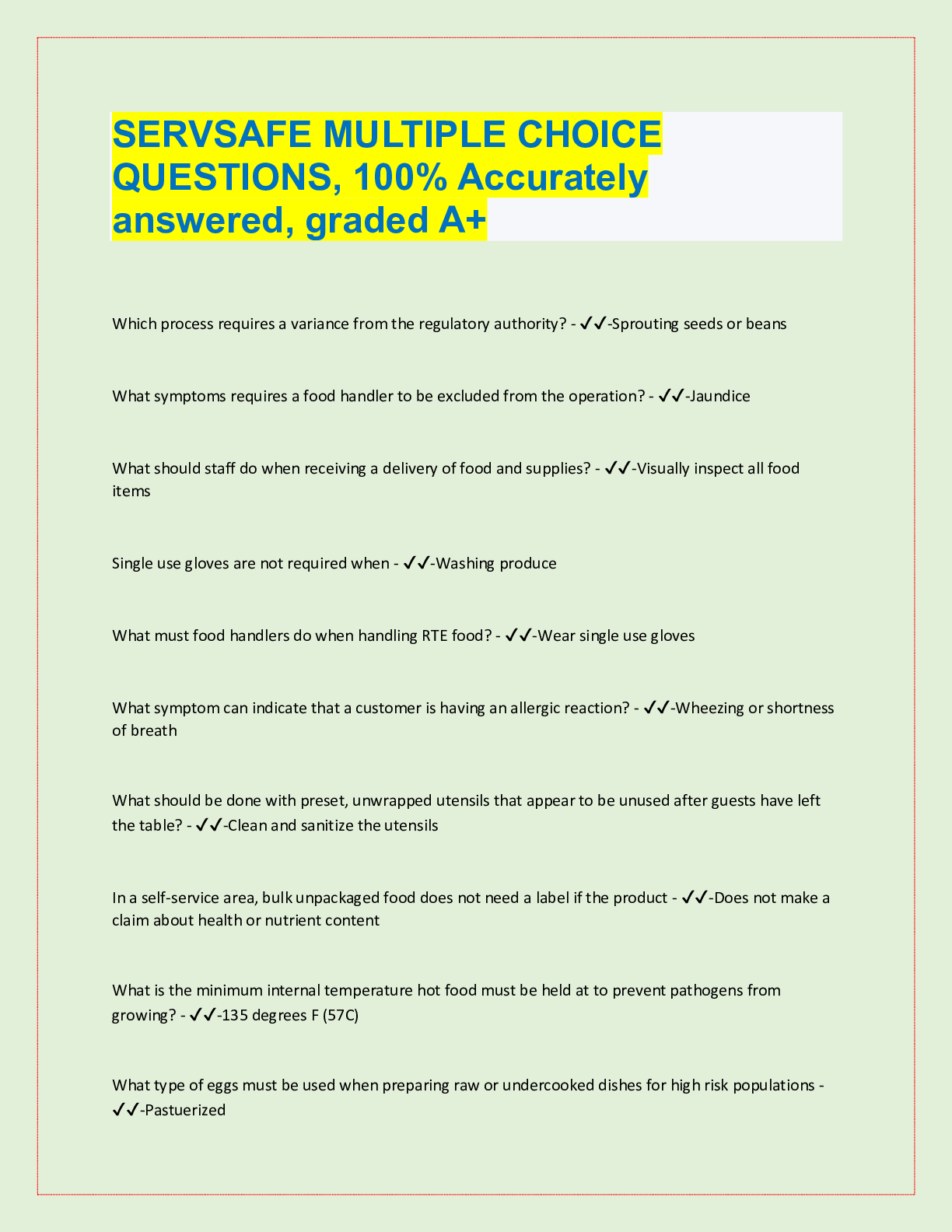 Nutrition > QUESTIONS & ANSWERS > ServSafe Study Questions Chapter 1 – 8. Top Questions with accurate answers, 100% Accurate, rated A+ (All)