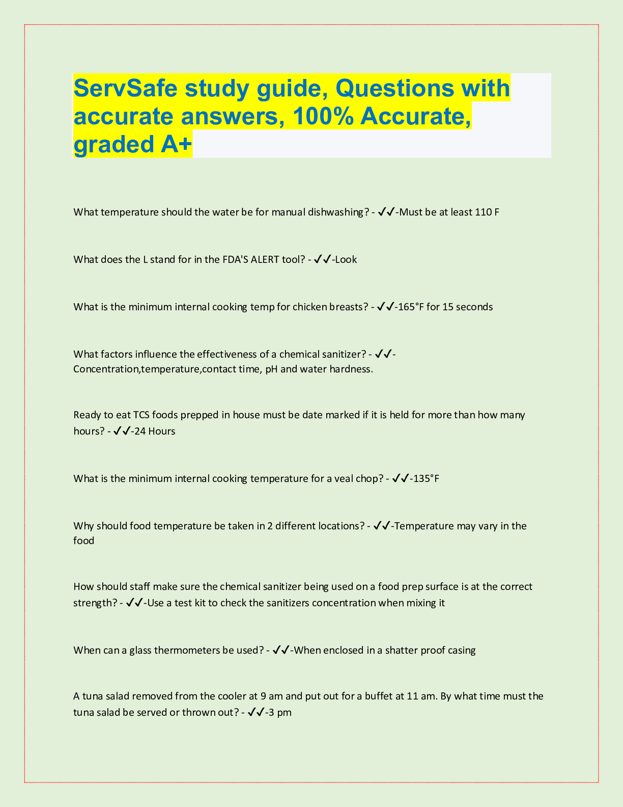 Nutrition > QUESTIONS & ANSWERS > ServSafe study guide, Questions with accurate answers, 100% Accurate, graded A+ (All)