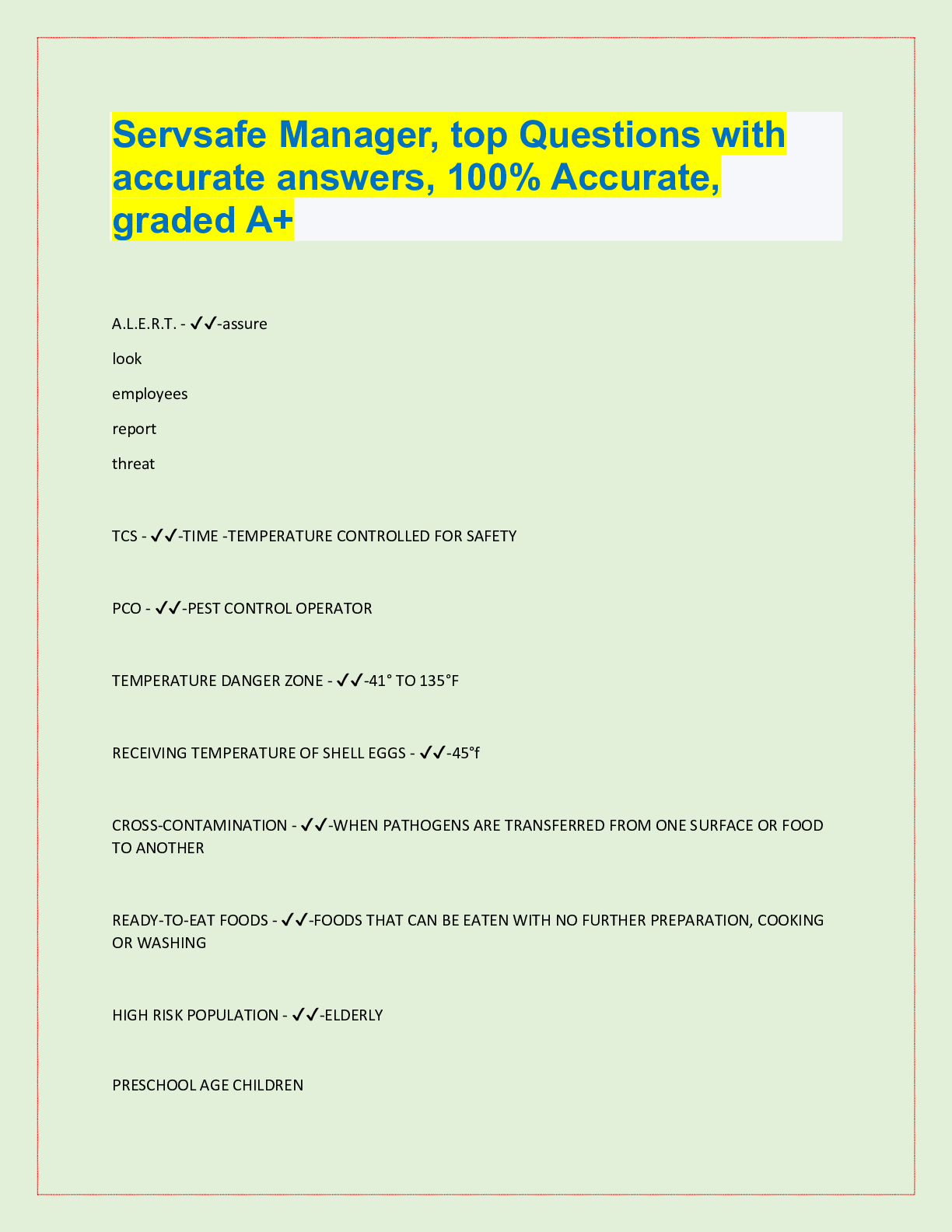 Nutrition > QUESTIONS & ANSWERS > Servsafe Manager, top Questions with accurate answers, 100% Accurate, graded A+ (All)