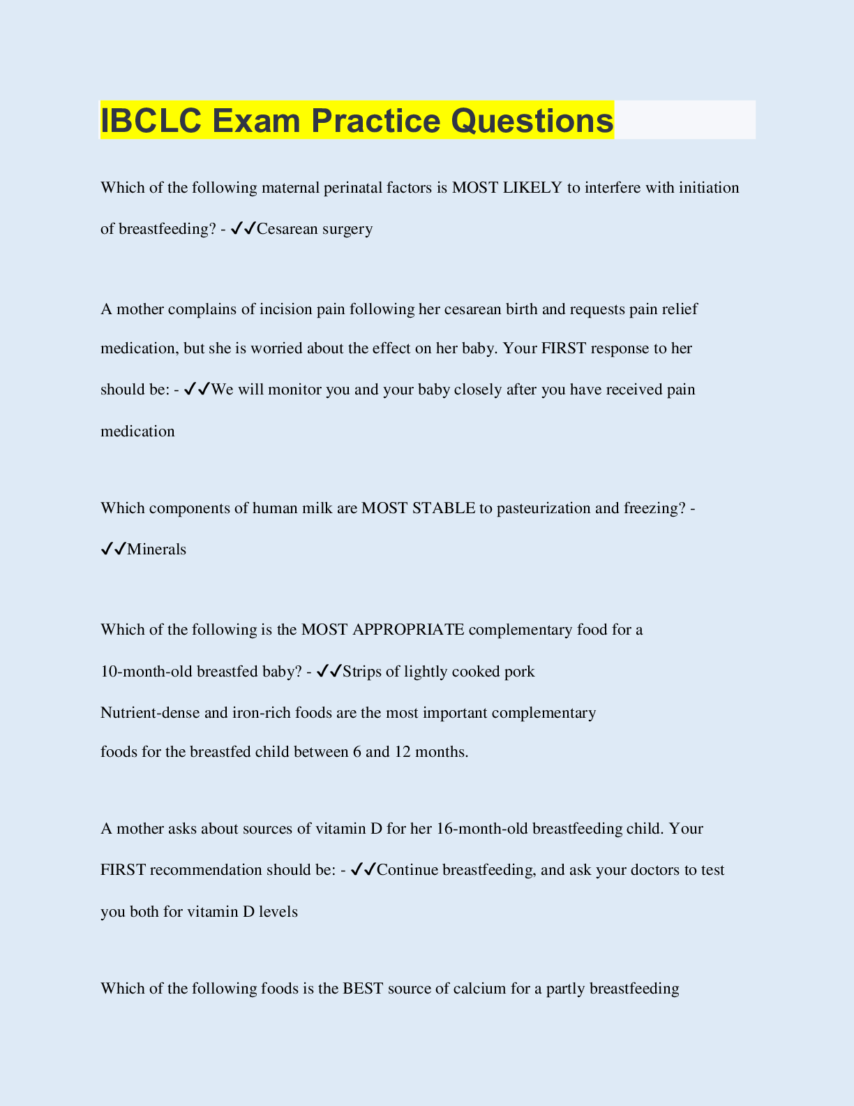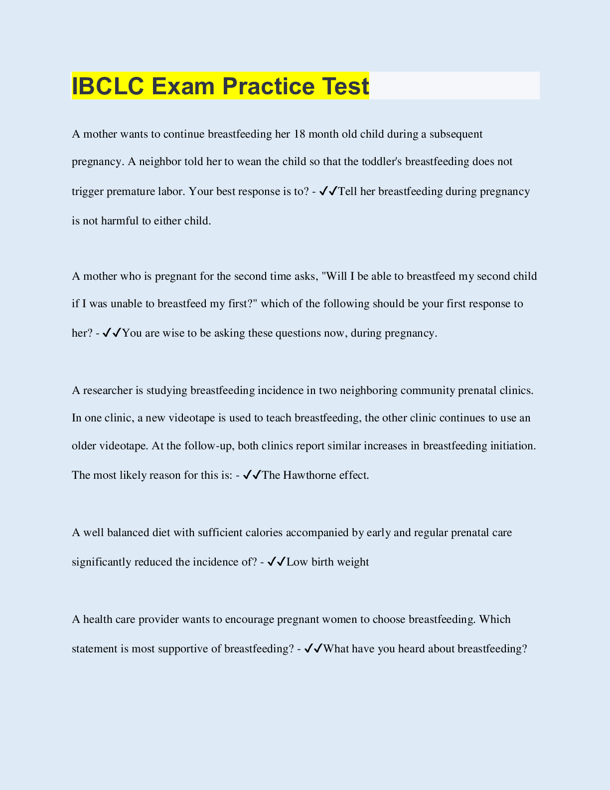 Nutrition > QUESTIONS & ANSWERS > IBCLC Exam Practice Test (All)