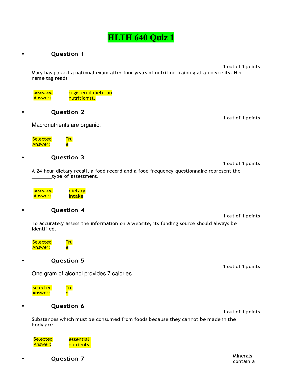 Nutrition > EXAM > HLTH 640 Quiz 1 with complete solutions (All)