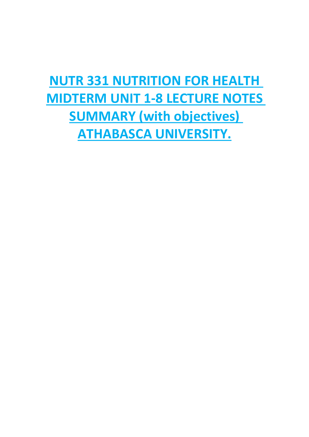 Nutrition > EXAM > NUTR 331 NUTRITION FOR HEALTH MIDTERM UNIT 1-8 LECTURE NOTES SUMMARY (with objectives) ATHABASCA UNIVERSITY (All)