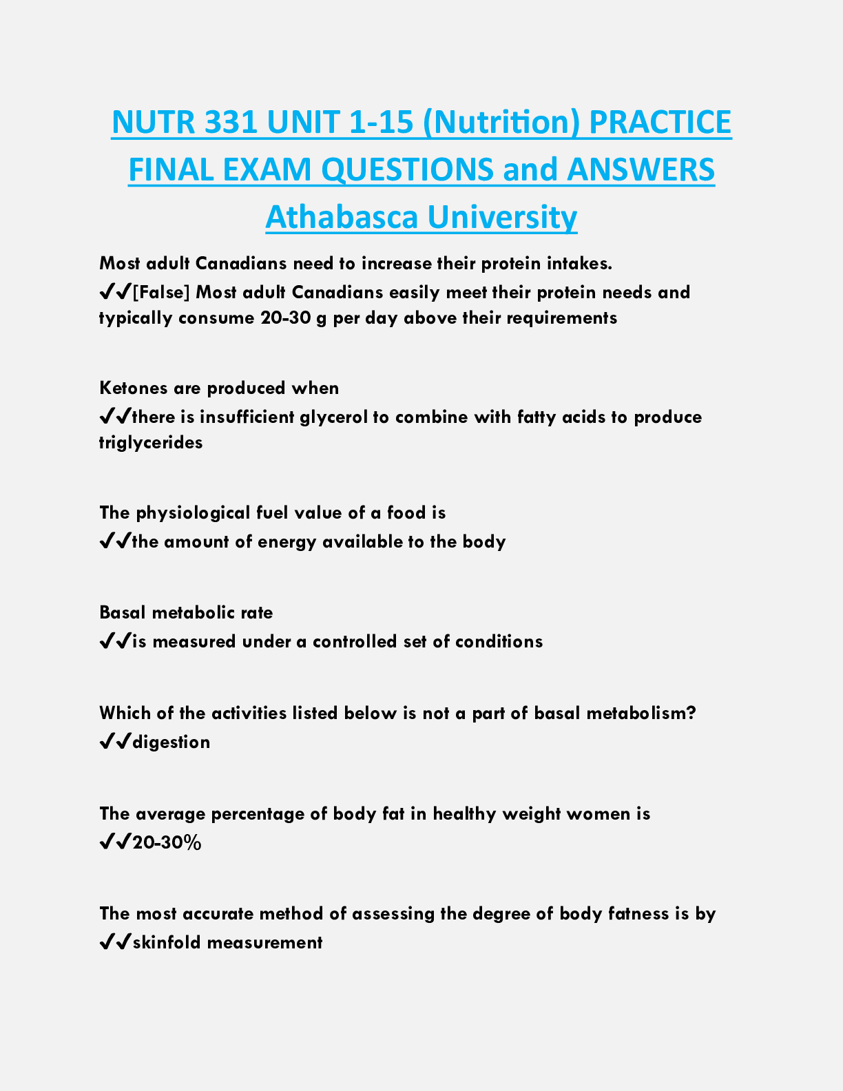 Nutrition > EXAM > NUTR 331 UNIT 1-15 (Nutrition) PRACTICE FINAL EXAM QUESTIONS and ANSWERS Athabasca University (All)