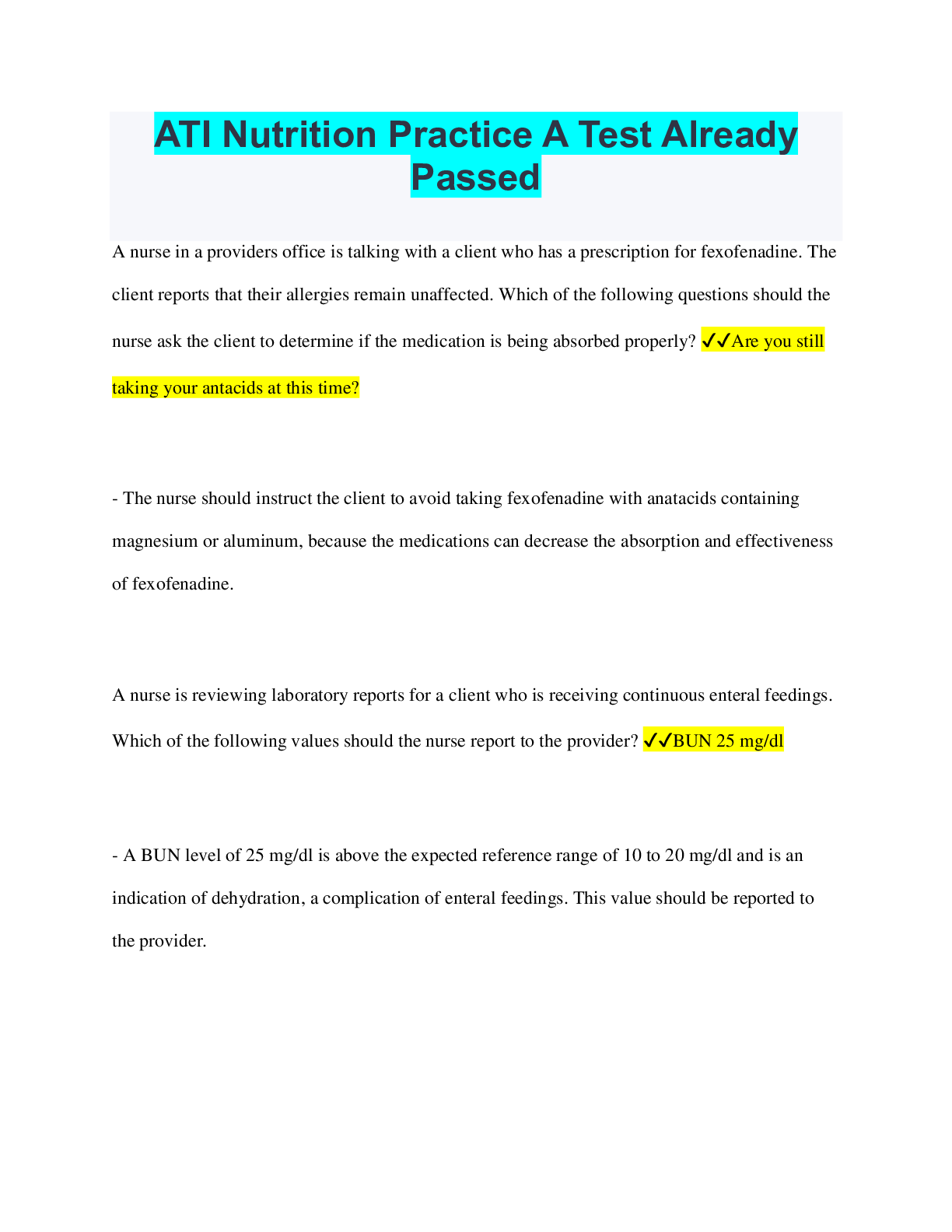 Nutrition > QUESTIONS & ANSWERS > ATI Nutrition Exam Questions and Answers Already Passed (All)