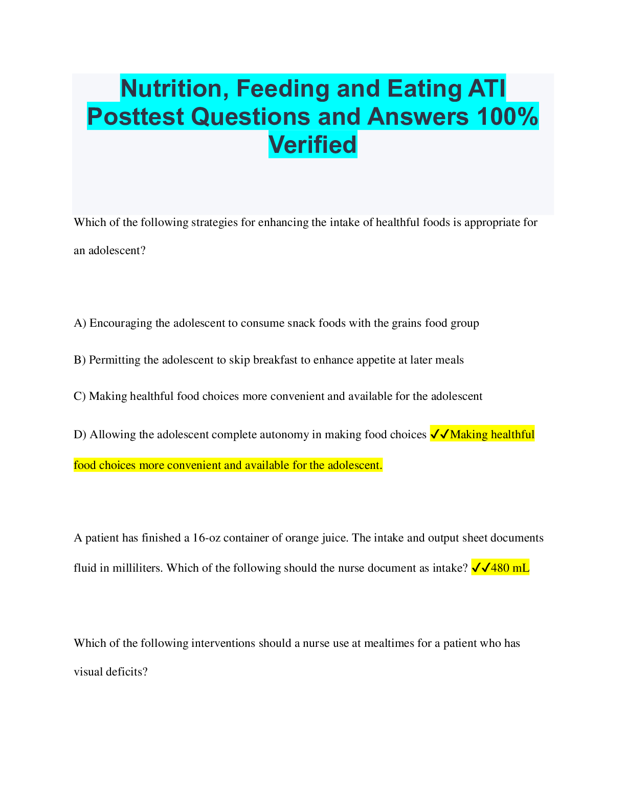 Nutrition > QUESTIONS & ANSWERS > Nutrition, Feeding and Eating ATI Posttest Questions and Answers 100% Verified (All)