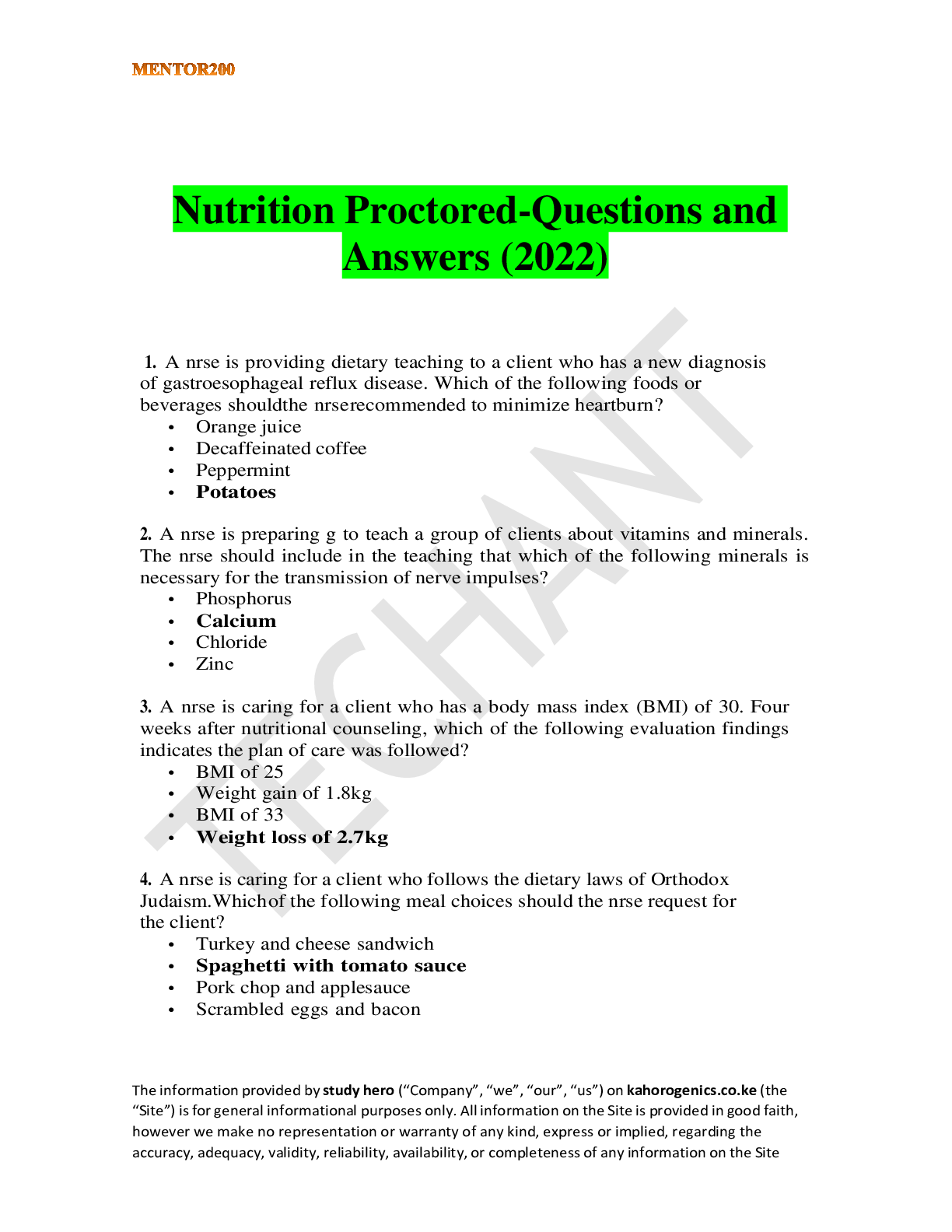 Nutrition > QUESTIONS & ANSWERS > NUTRITION PRACTICE PROCTORED QUESTIONS AND ANSWERS {95 Q & A} (All)