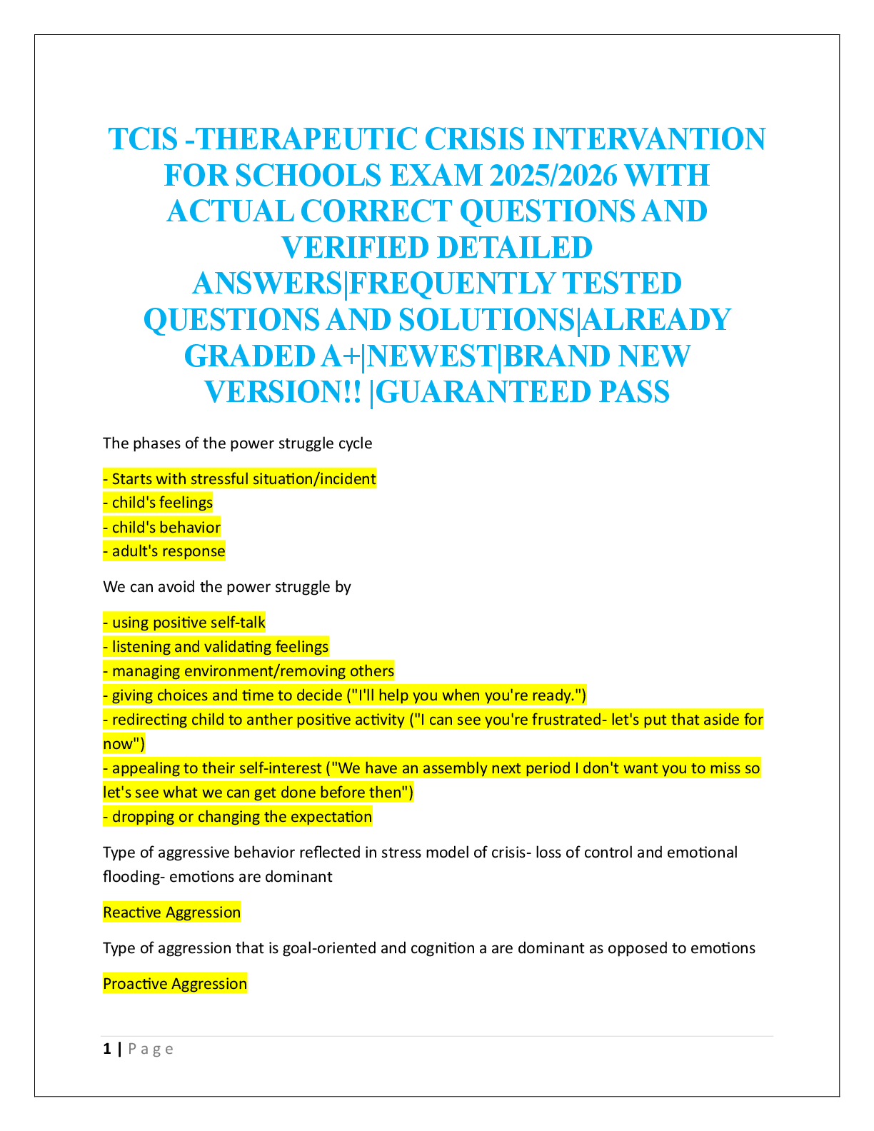 Occupational Therapy > EXAM > TCIS -THERAPEUTIC CRISIS INTERVANTION FOR SCHOOLS EXAM (All)