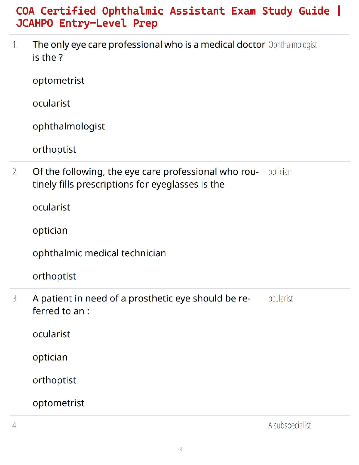 Ophthalmology > STUDY GUIDE > COA Certified Ophthalmic Assistant Exam Study Guide | JCAHPO Entry-Level Prep (All)