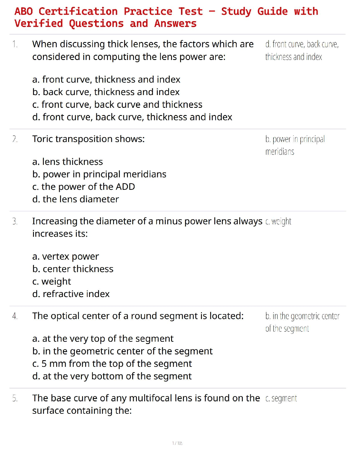 Optometry > STUDY GUIDE > ABO Certification Practice Test – Study Guide with Verified Questions and Answers (All)