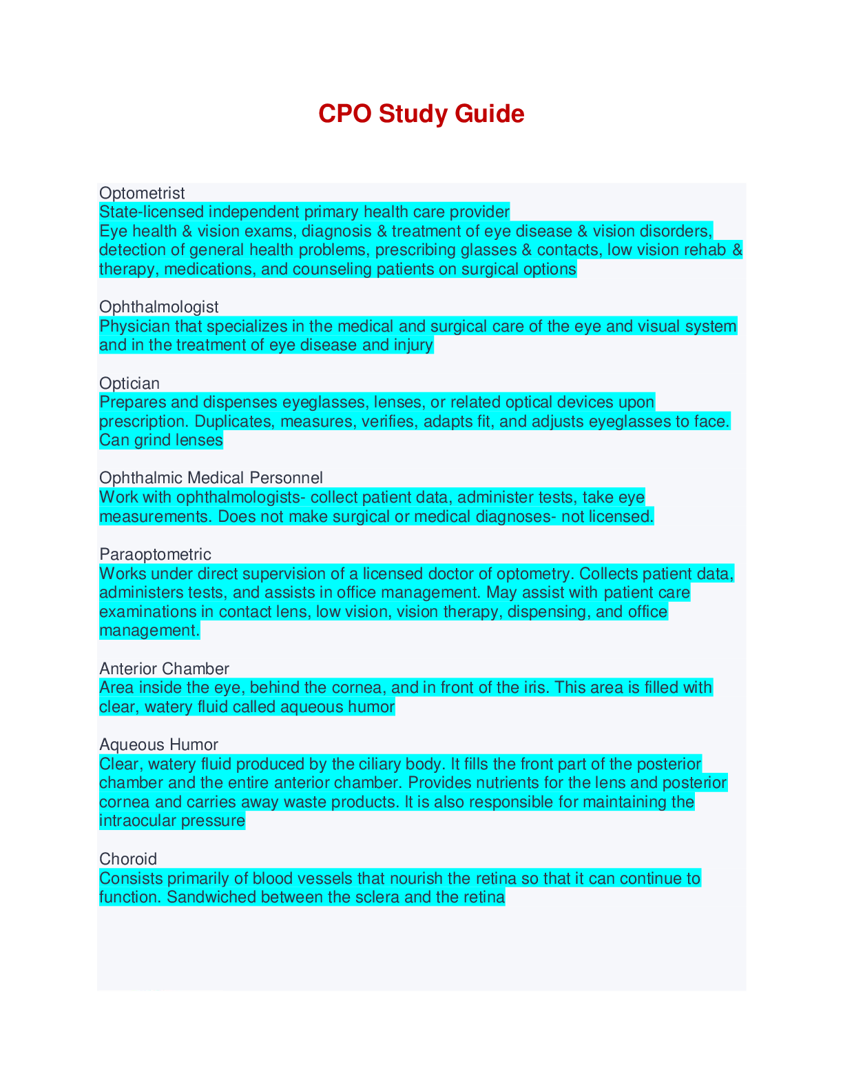 Optometry > QUESTIONS & ANSWERS > Certified Paraoptometric (CPO) Exam Latest 2023 Already Passed (All)