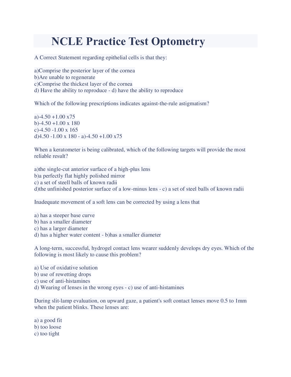 Optometry > EXAM > NCLE Practice Test Optometry Questions And Answers (All)