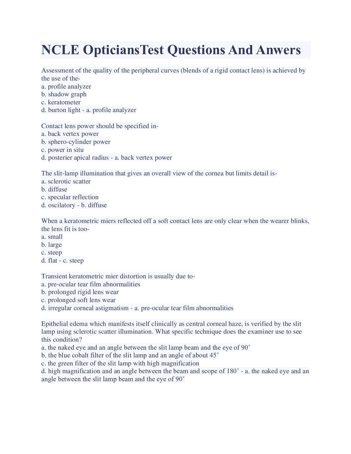 Optometry > EXAM > NCLE OpticiansTest Questions And Answers (All)