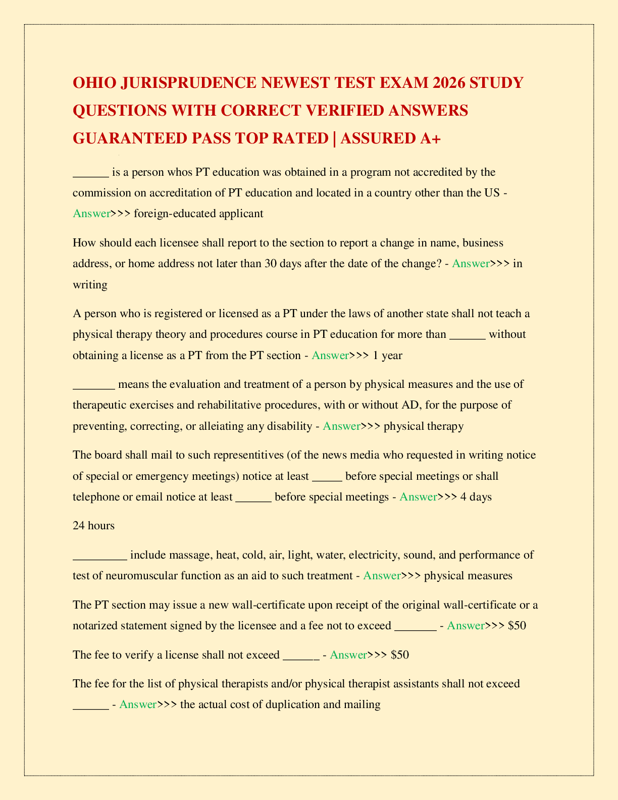 Physical Therapy > EXAMs > OHIO JURISPRUDENCE NEWEST TEST EXAM 2026 STUDY QUESTIONS WITH CORRECT VERIFIED ANSWERS GUARANTEED PASS TOP RATED | ASSURED A+ (All)