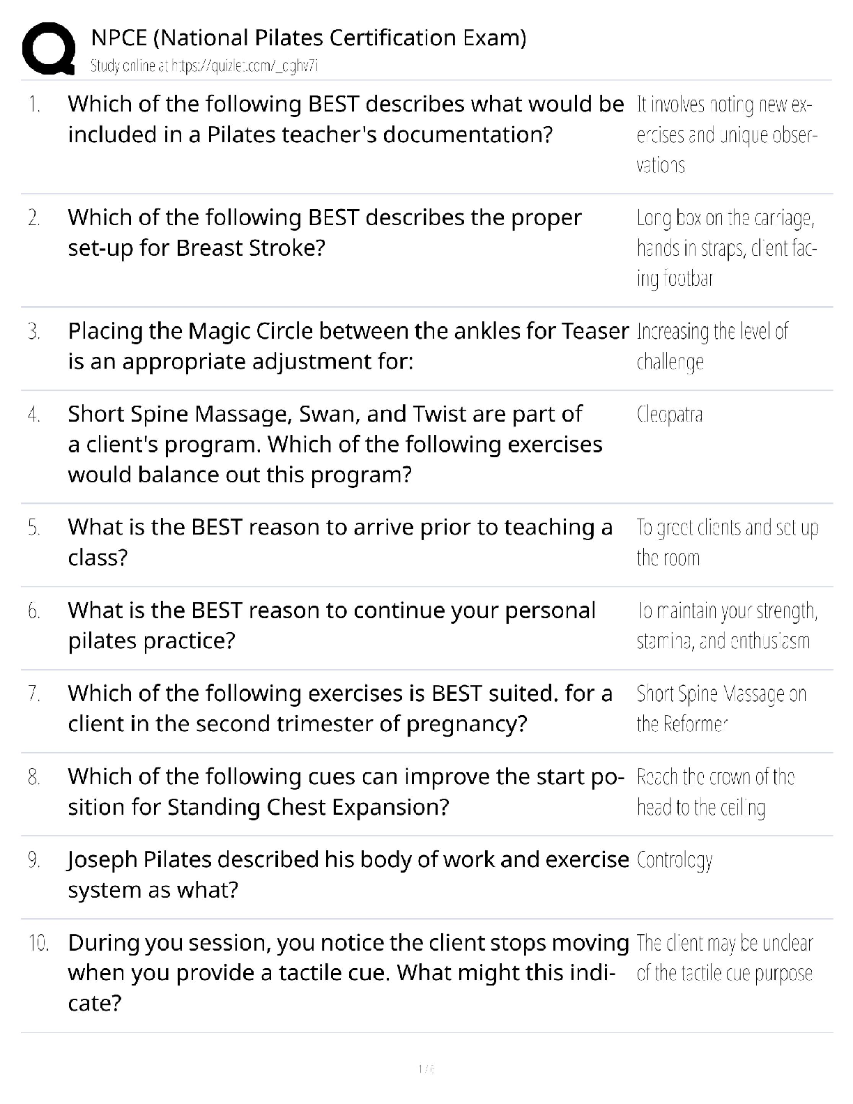 Physical Therapy > QUESTIONS & ANSWERS > NPCE Study Guide / National Pilates Certification Exam / 2026 Update / Practice Test & Answers (All)
