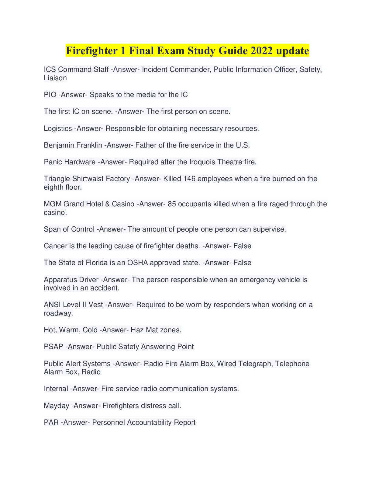 Public Health > QUESTIONS & ANSWERS > Firefighter 1 Final Exam Study Guide 2022 update (All)