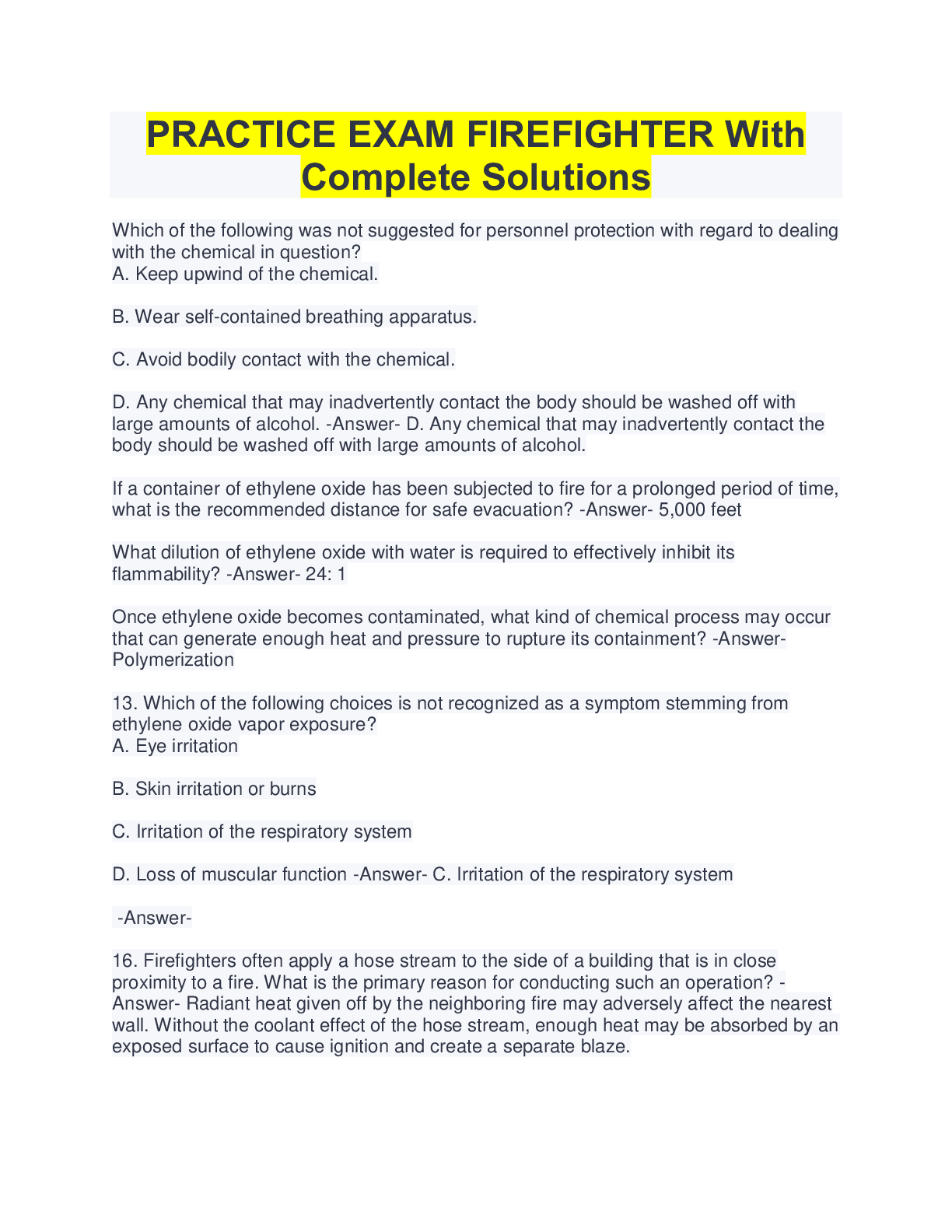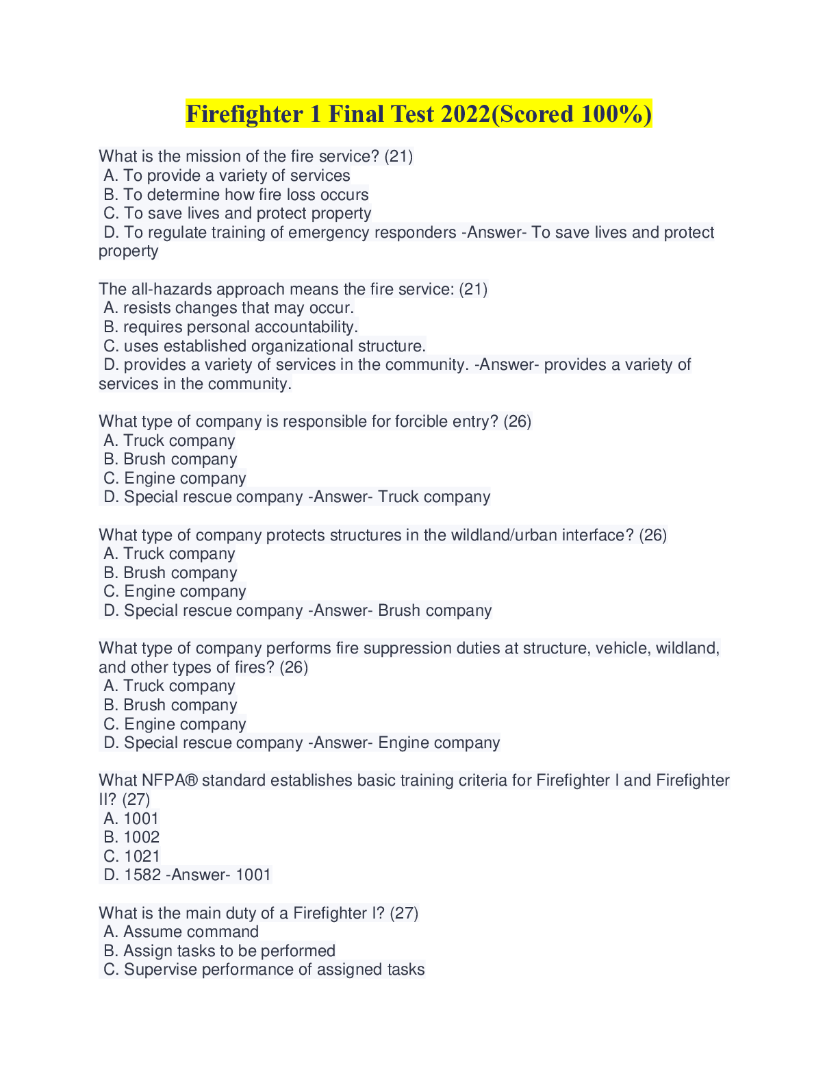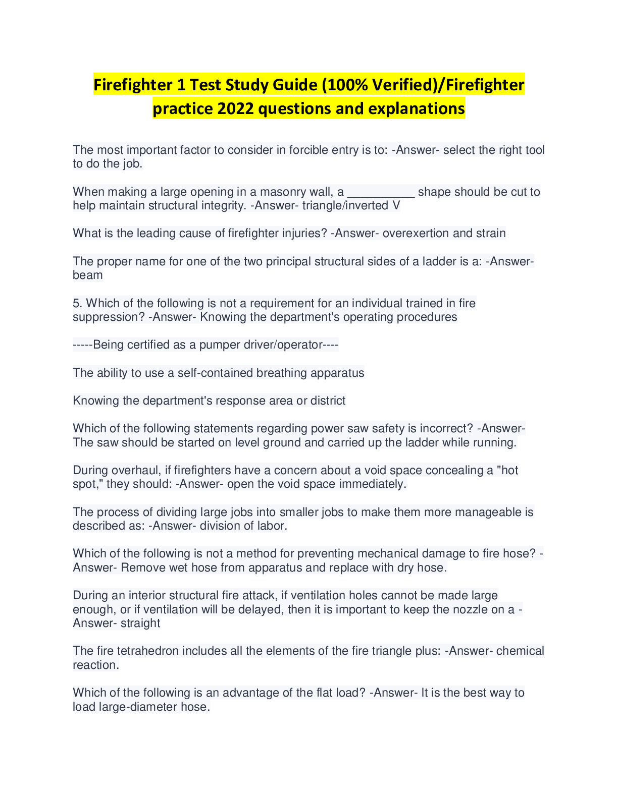 Public Health > QUESTIONS & ANSWERS > Firefighter 1 Test Study Guide (100% Verified)/Firefighter practice 2022 questions and explanations (All)