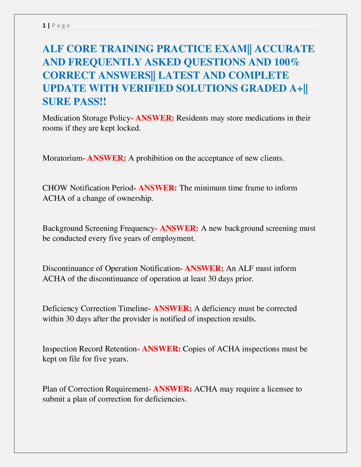 Public Health > EXAM > ALF CORE TRAINING PRACTICE EXAM|| ACCURATE AND FREQUENTLY ASKED QUESTIONS AND 100% CORRECT ANSWERS|| LATEST AND COMPLETE UPDATE WITH VERIFIED SOLUTIONS GRADED A+|| SURE PASS!! (All)