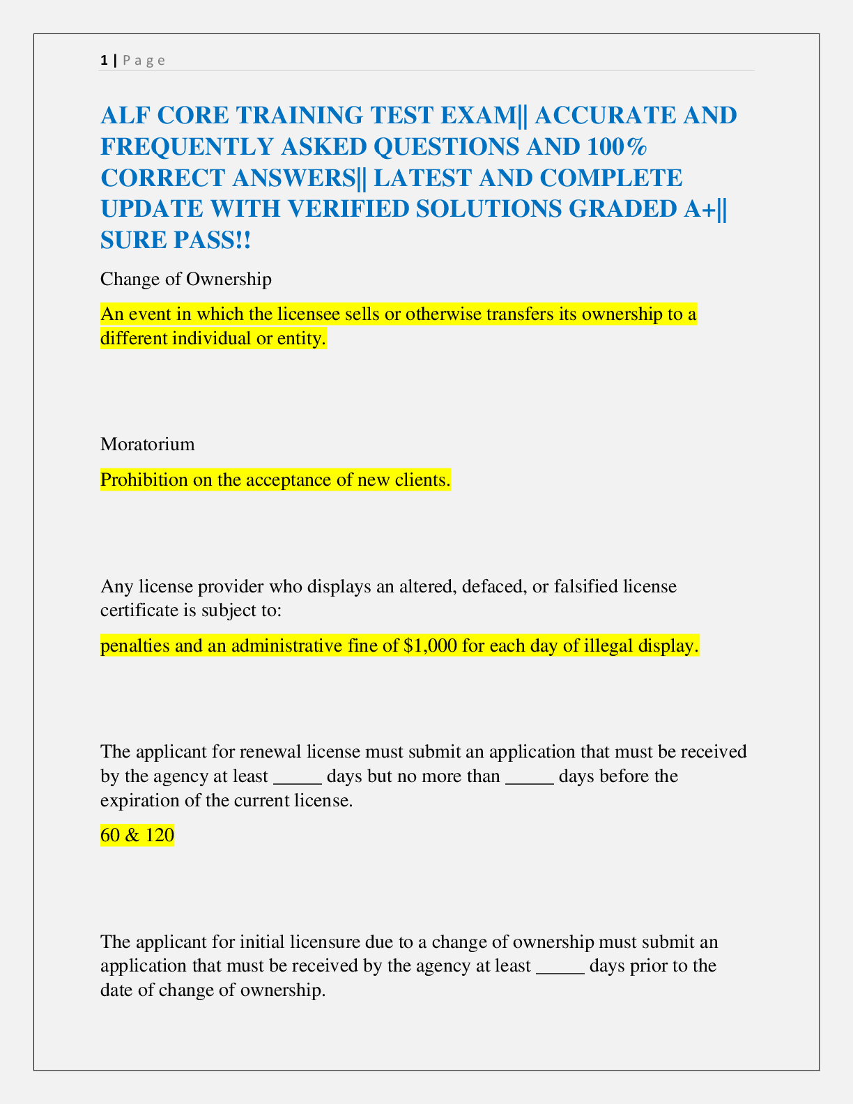 Public Health > EXAM > ALF CORE TRAINING TEST EXAM|| ACCURATE AND FREQUENTLY ASKED QUESTIONS AND 100% CORRECT ANSWERS|| LATEST AND COMPLETE UPDATE WITH VERIFIED SOLUTIONS GRADED A+|| SURE PASS!! (All)