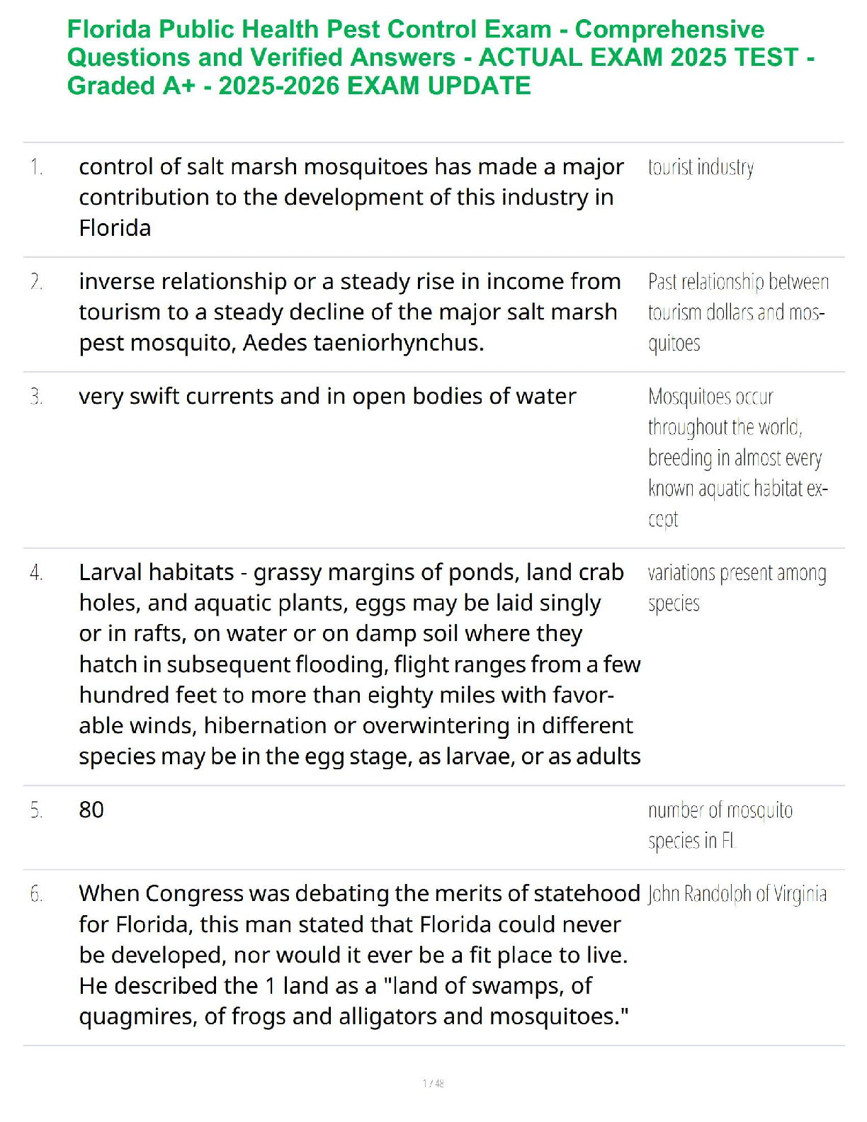 Public Health > QUESTIONS & ANSWERS > Florida Public Health Pest Control Exam - Comprehensive Questions and Verified Answers - ACTUAL EXAM 2025 TEST - Graded A+ - 2025-2026 EXAM UPDATE (All)