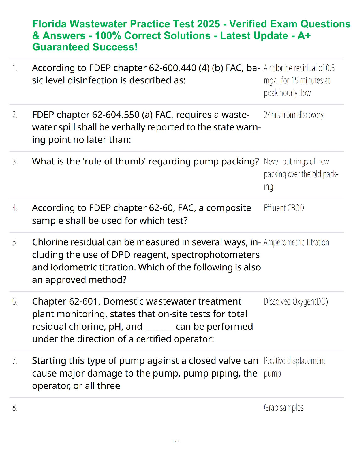 Public Health > STUDY GUIDE > Florida Wastewater Practice Test 2025 - Verified Exam Questions & Answers - 100% Correct Solutions - Latest Update - A+ Guaranteed Success! (All)