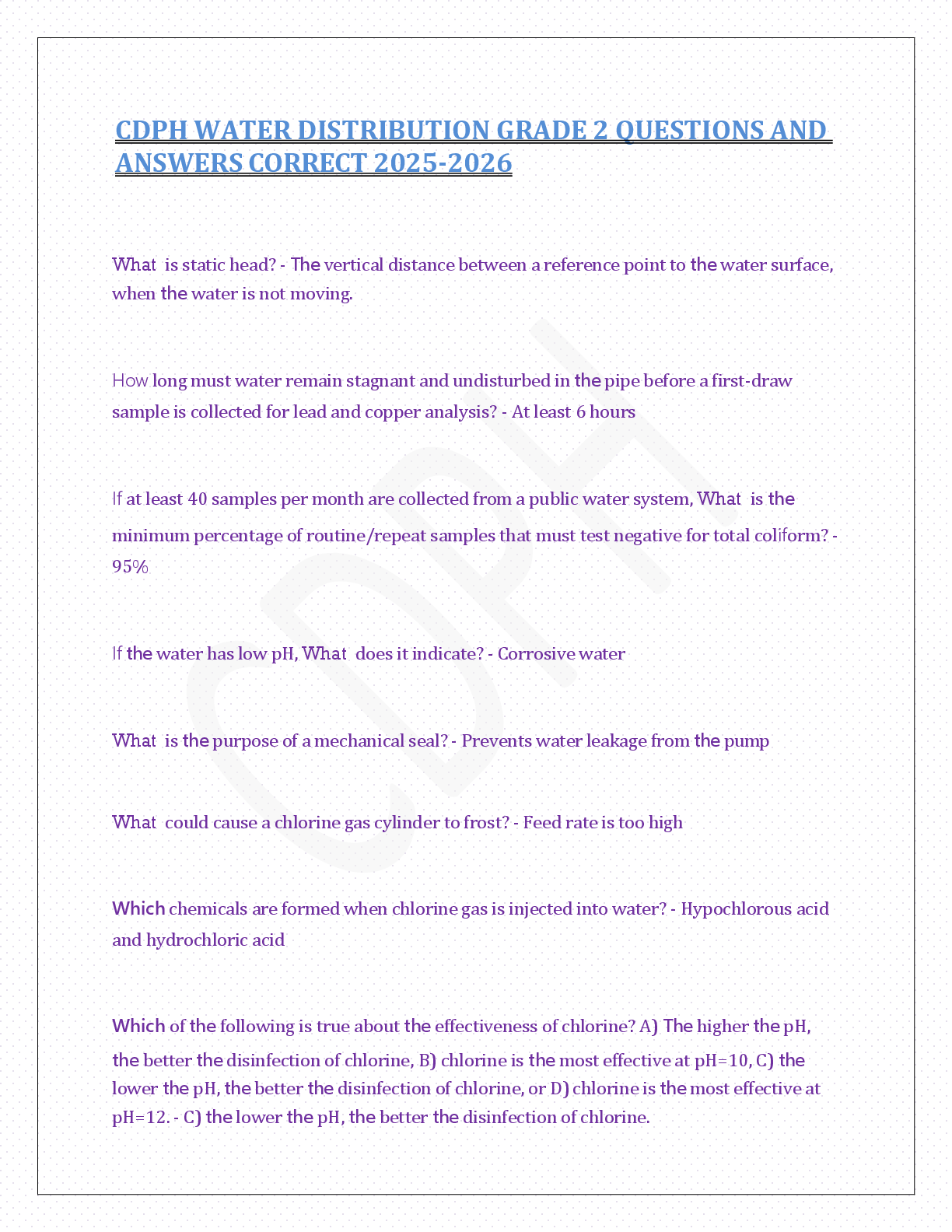 Public Health > EXAM > CDPH California Department of Public Health,WATER DISTRIBUTION GRADE 2 QUESTIONS AND ANSWERS CORRECT 2025-2026 (All)