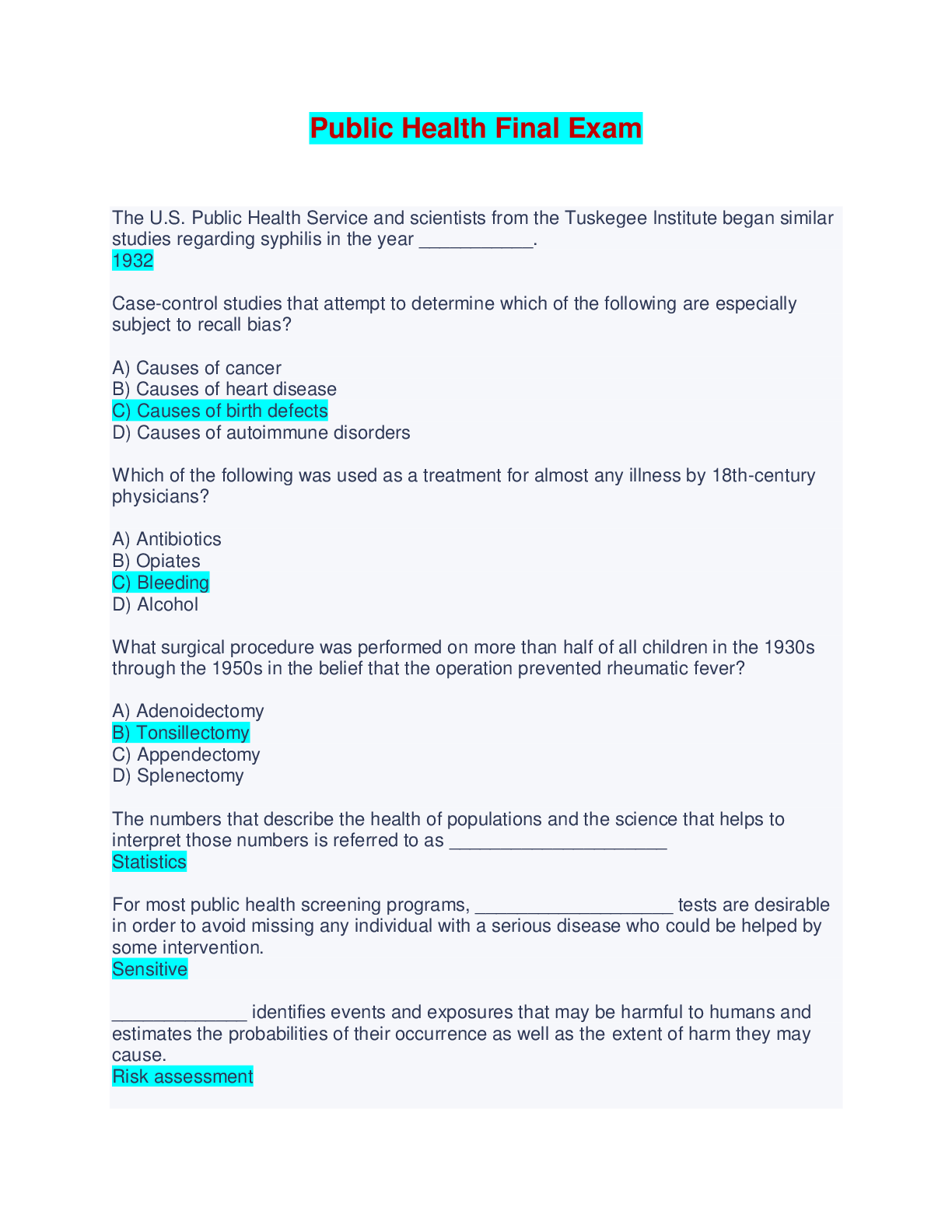 Public Health > EXAM > Public Health Final Exam - Question and Answers (All)