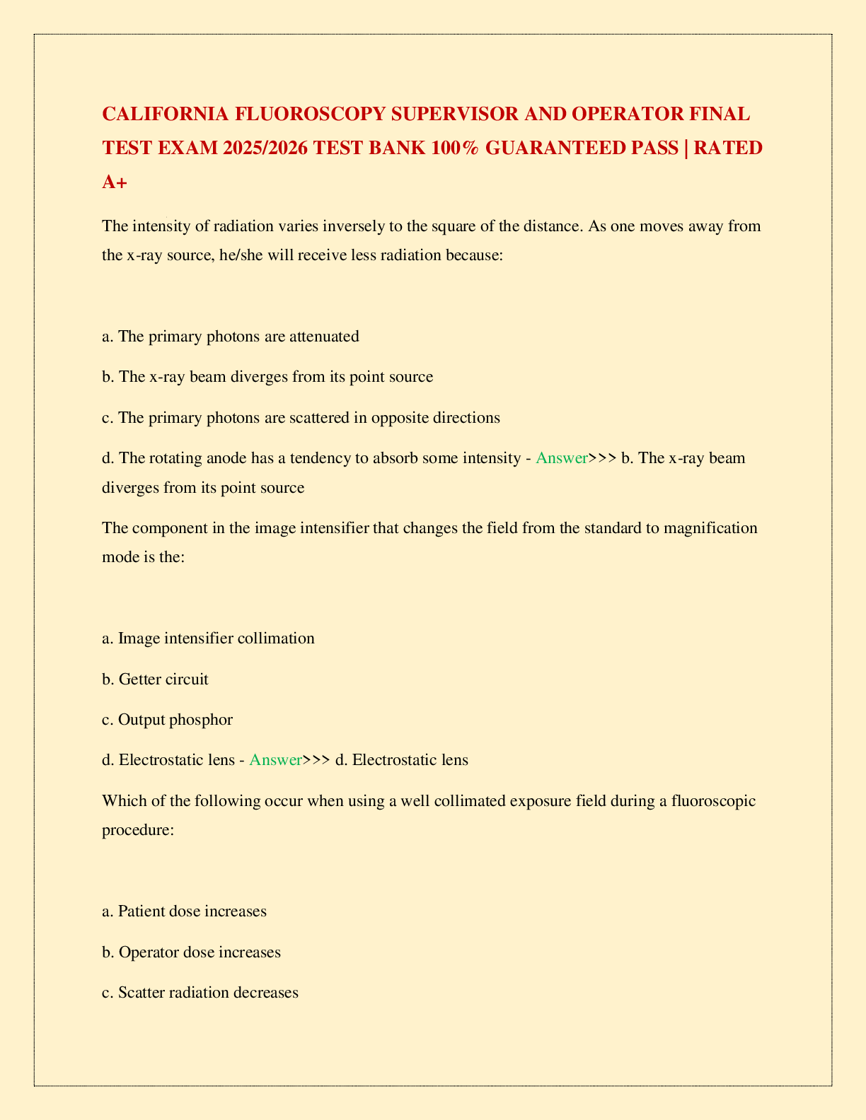 Radiology > EXAM > CALIFORNIA FLUOROSCOPY SUPERVISOR AND OPERATOR FINAL TEST EXAM 2025/2026 TEST BANK 100% GUARANTEED PASS | RATED A+ (All)