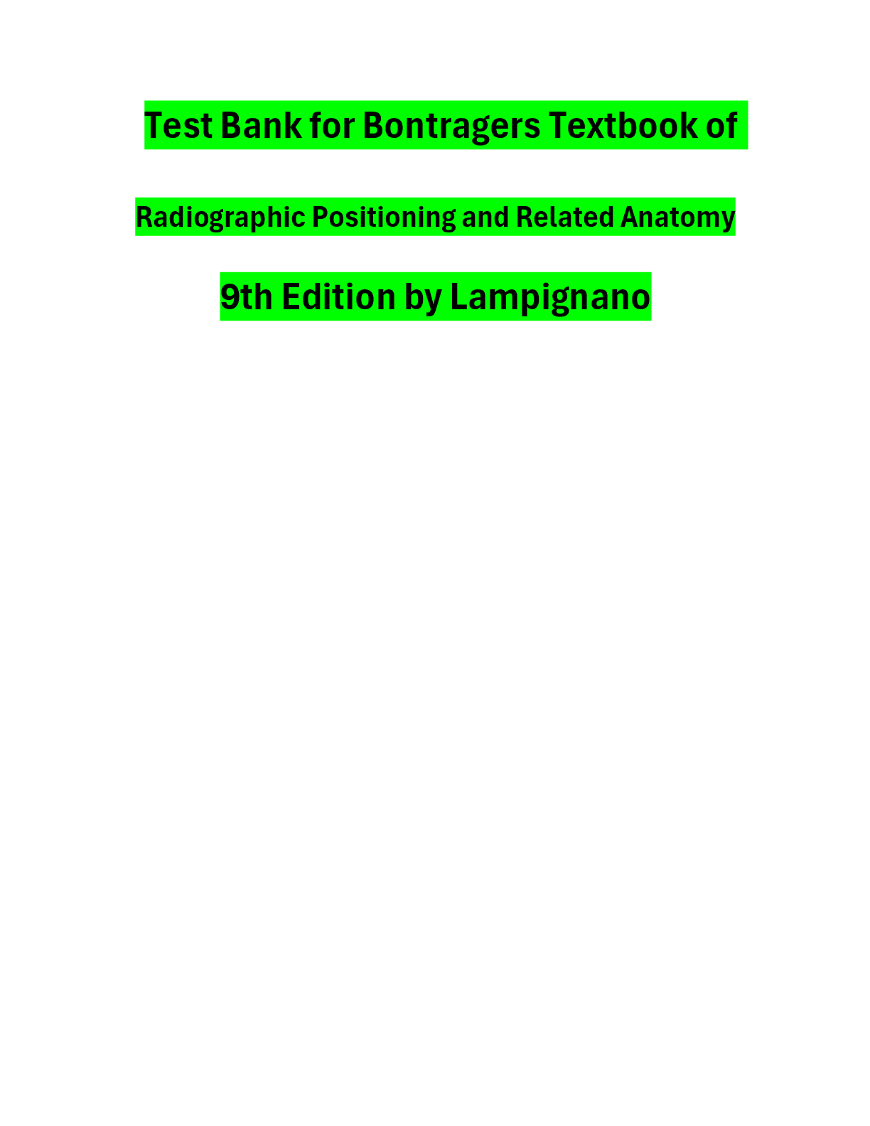 Radiology > TEST BANKS > TEST BANK FOR Textbook of Radiographic Positioning and Related Anatomy11th Edition by John Lampignano & Leslie E. Kendrick All Chapters 1-20 A+ (All)