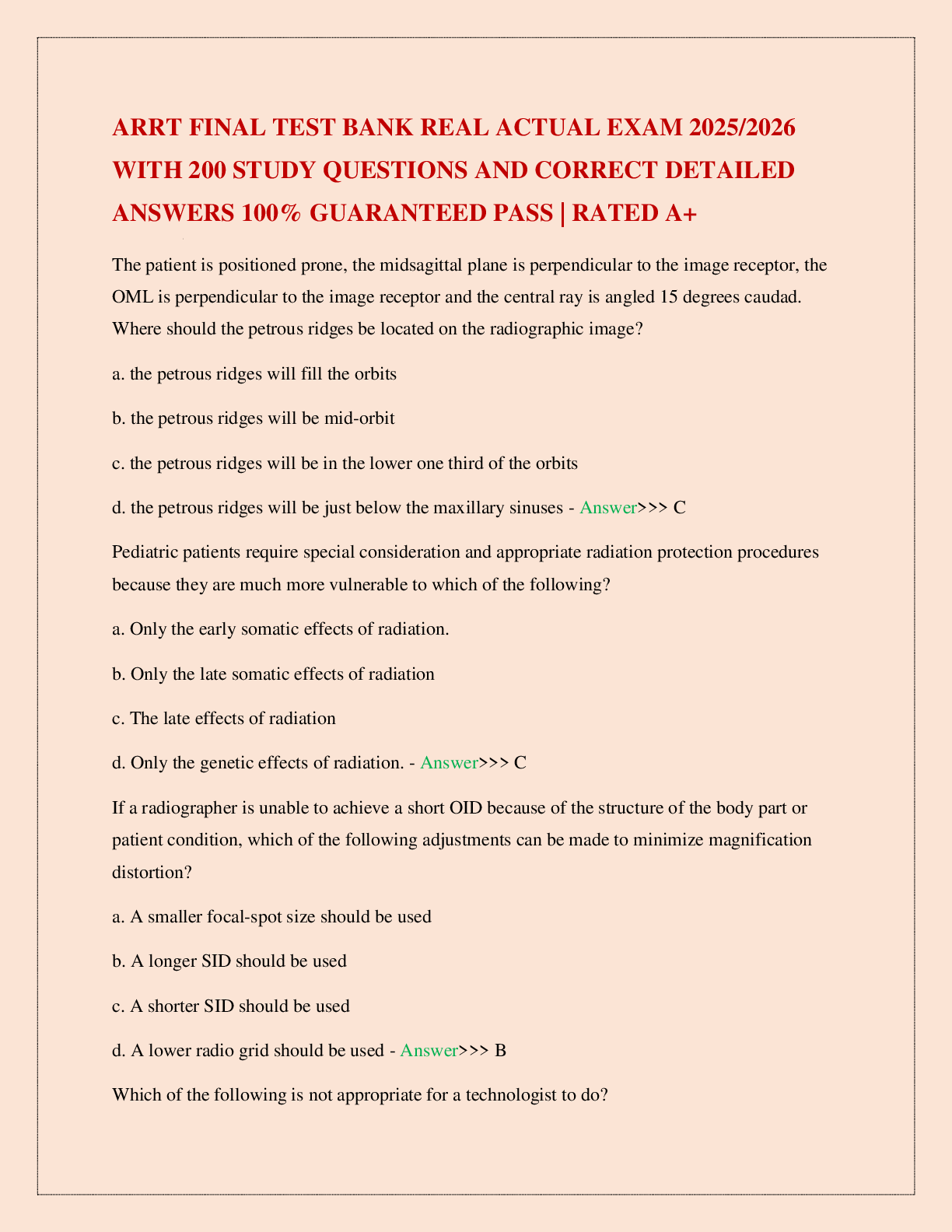 Radiology > EXAM > ARRT FINAL TEST BANK REAL ACTUAL EXAM 2025/2026 WITH 200 STUDY QUESTIONS AND CORRECT DETAILED ANSWERS 100% GUARANTEED PASS | RATED A+ (All)
