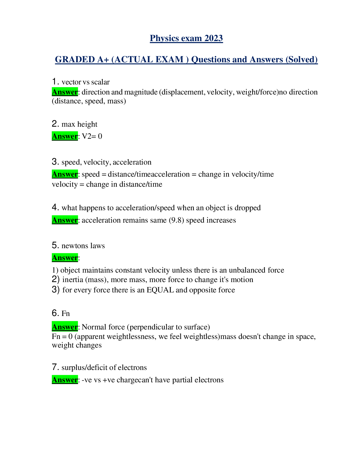 Physical Education > EXAM > Physics exam 2023 GRADED A+ (ACTUAL EXAM ) Questions and Answers (Solved) (All)