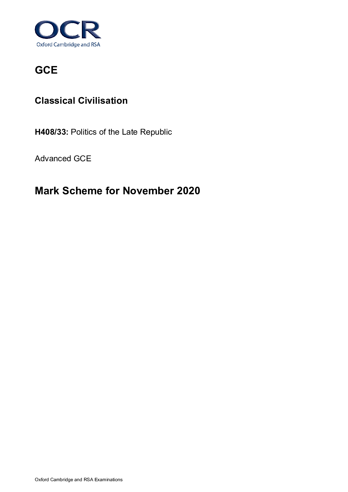 Classical Civilisation > AS Mark Scheme > GCE Classical Civilisation H408/33: Politics of the Late Republic Advanced GCE Mark Scheme for November 2020 (All)