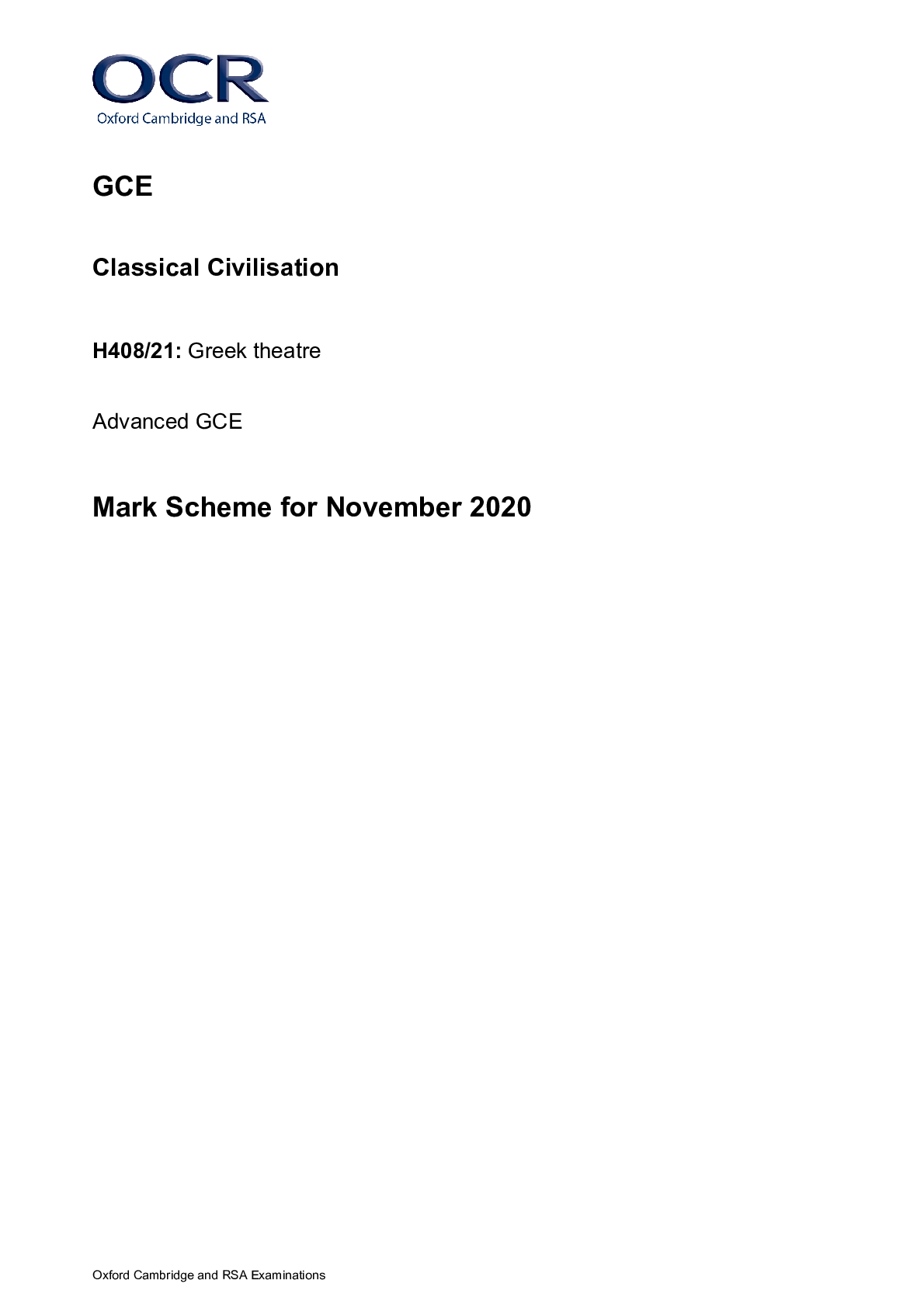 Classical Civilisation > AS Mark Scheme > GCE Classical Civilisation H408/21: Greek theatre Advanced GCE Mark Scheme for November 2020 (All)