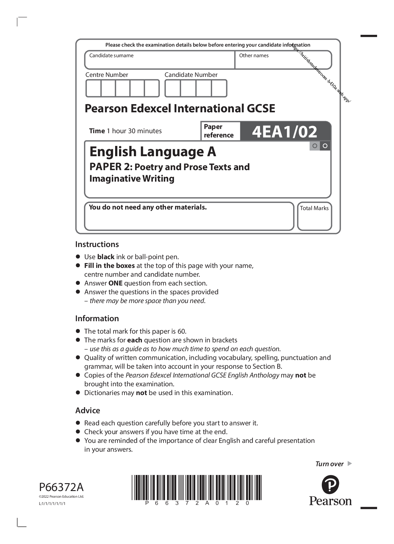 English Language > Edexcel > Pearson Edexcel International_GCSE English Language A_4EA1/02 Question Paper Jan 2022 | PAPER 2: Poetry and Prose Texts and Imaginative Writing (All)