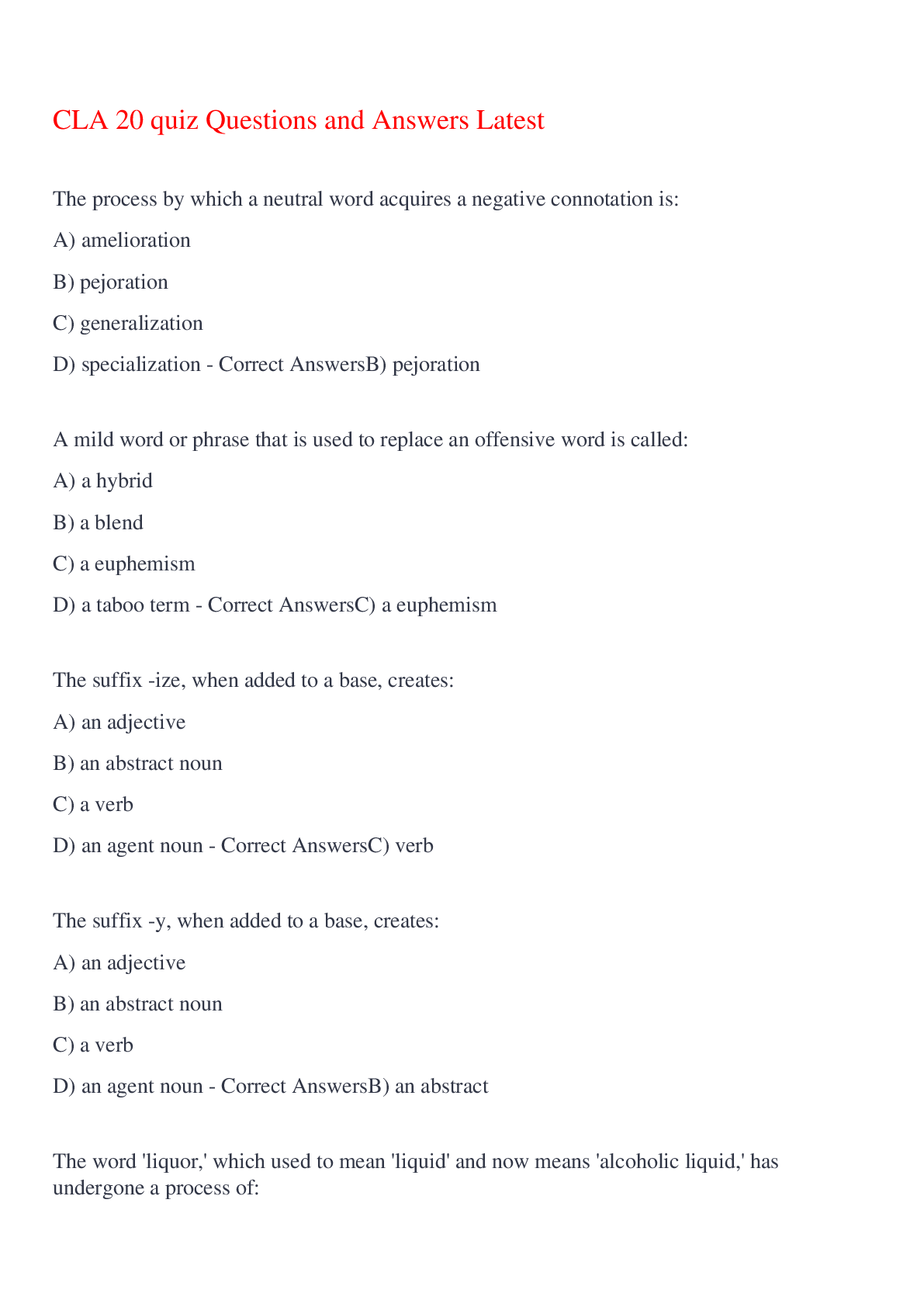 English Language > EXAM > CLA 20 quiz Questions and Answers Latest,100% CORRECT (All)