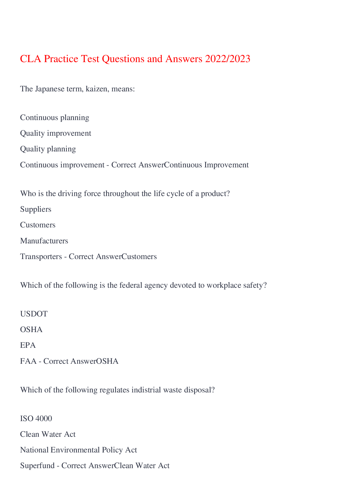 English Language > EXAM > CLA Practice Test Questions and Answers 2022/2023,100% CORRECT (All)