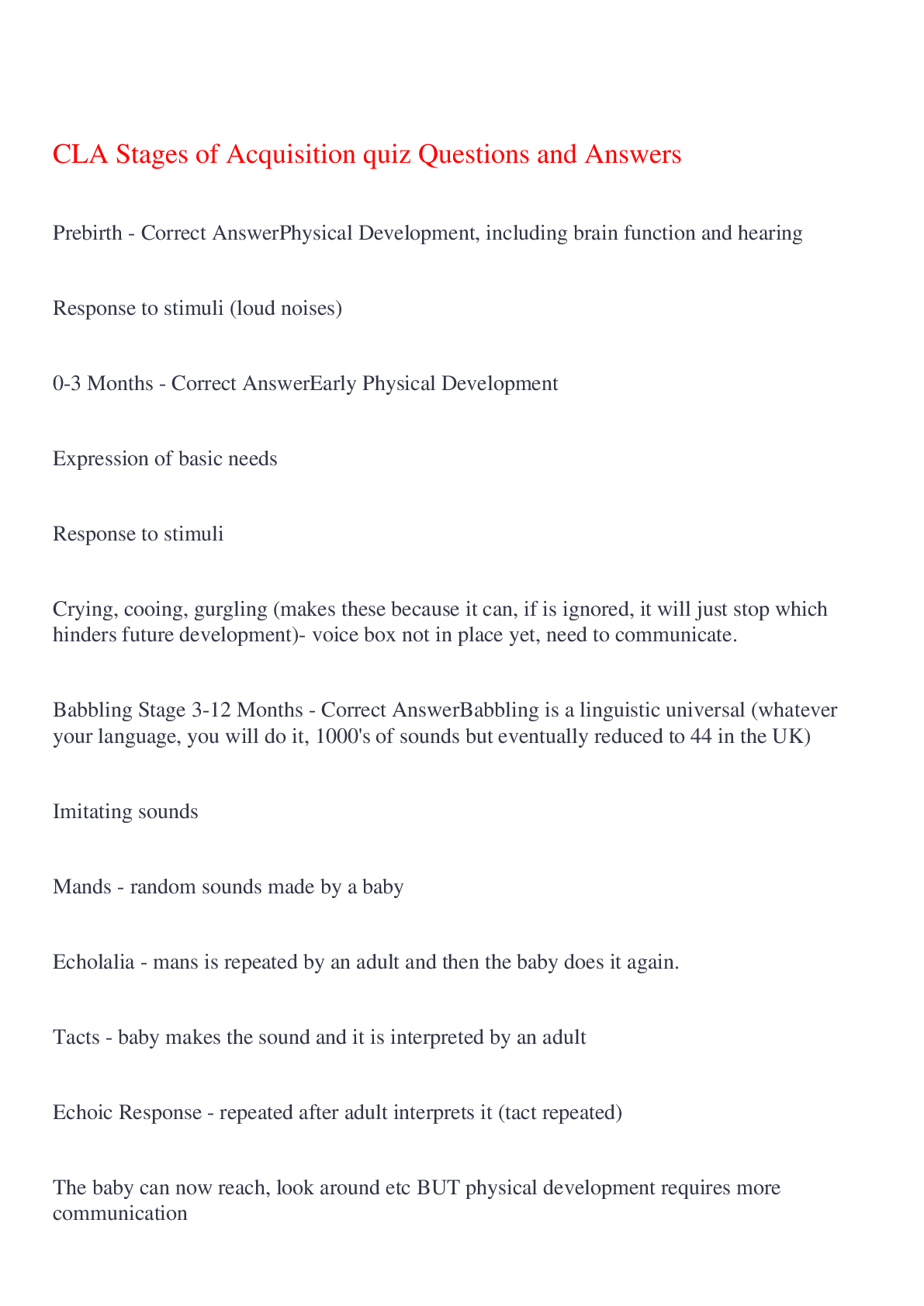 English Language > EXAM > CLA Stages of Acquisition quiz Questions and Answers,100% CORRECT (All)