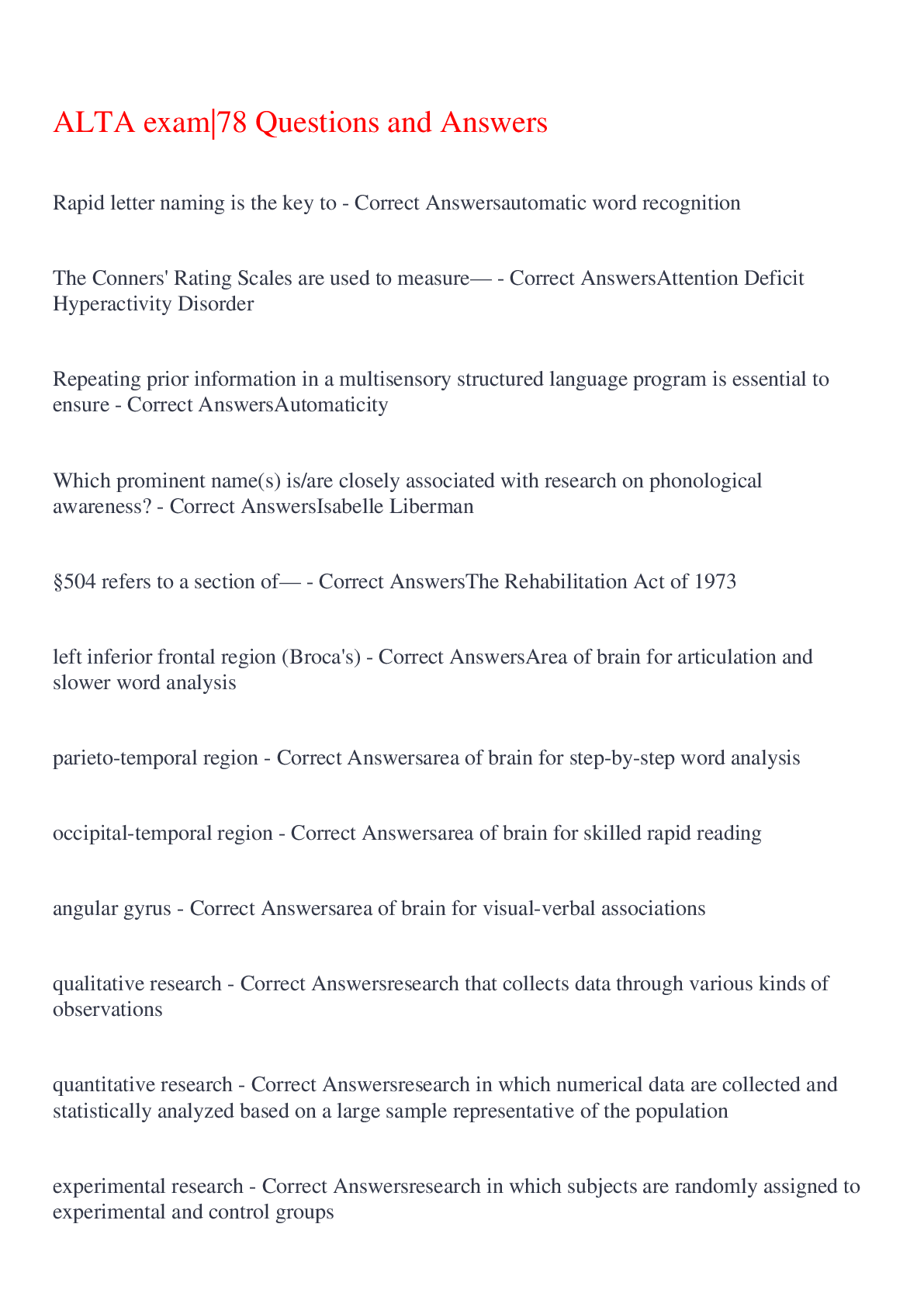 English Language > EXAM > ALTA exam|78 Questions and Answers,100% CORRECT (All)