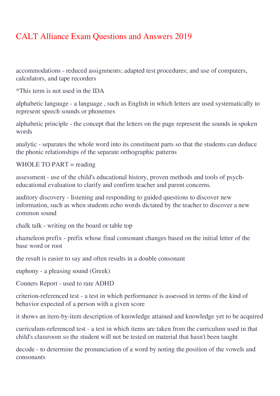 English Language > EXAM > CALT Alliance Exam Questions and Answers 2019,100% CORRECT (All)