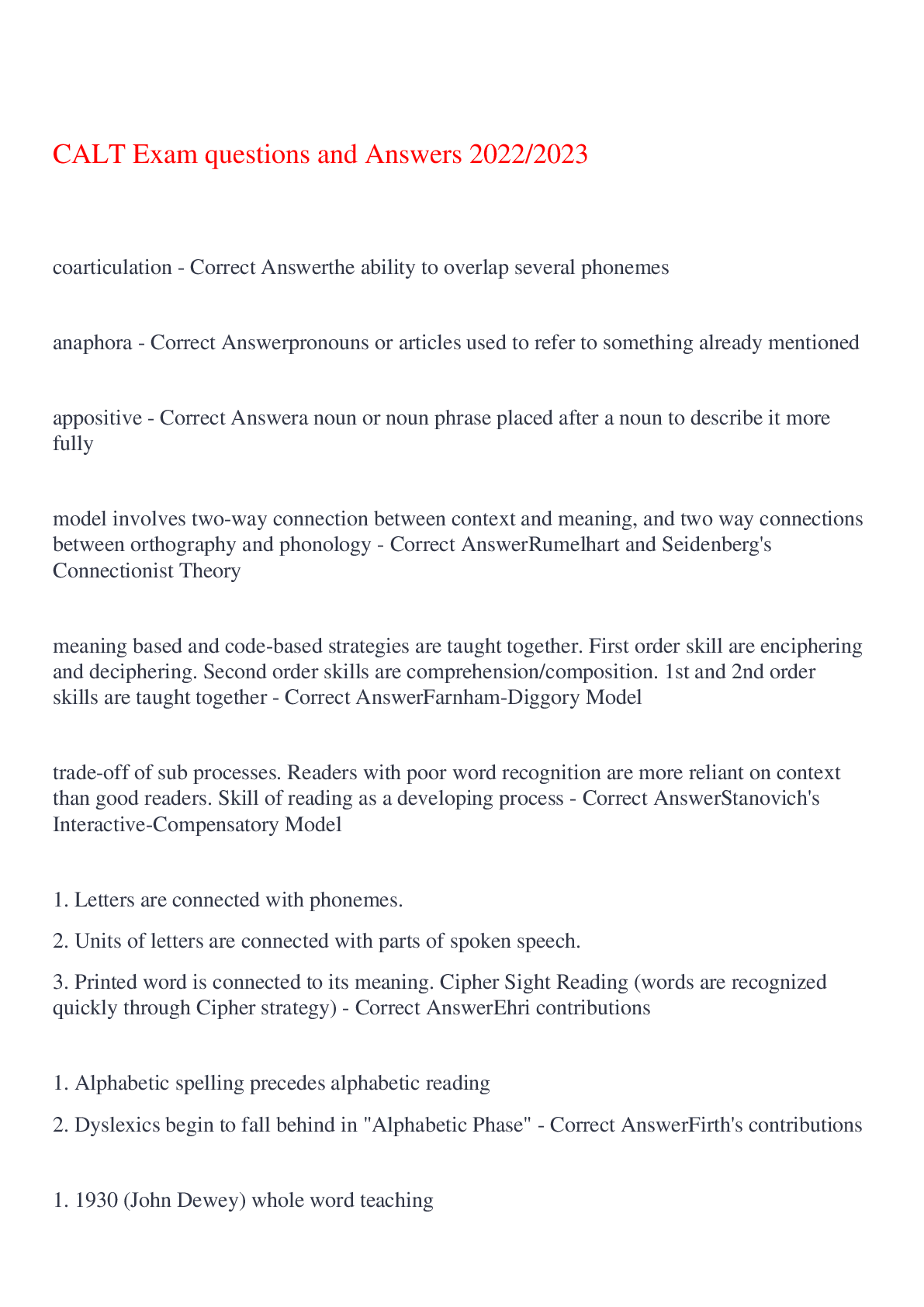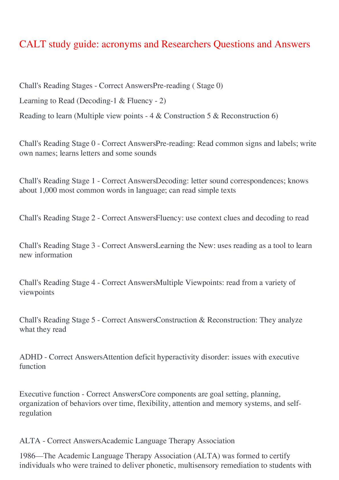 English Language > EXAM > CALT study guide: acronyms and Researchers Questions and Answers,100% CORRECT (All)