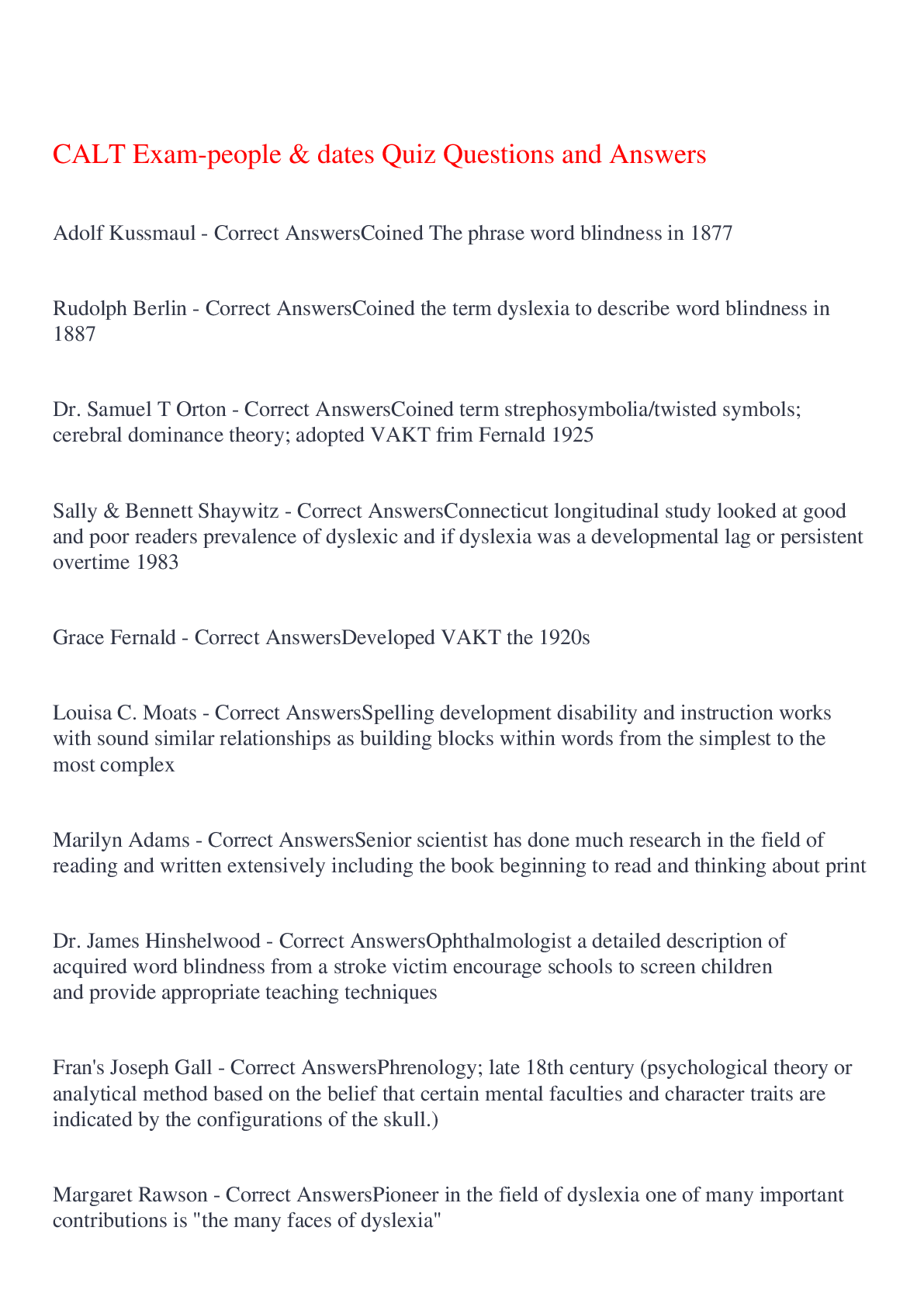 English Language > EXAM > CALT Exam-people & dates Quiz Questions and Answers,100% CORRECT (All)
