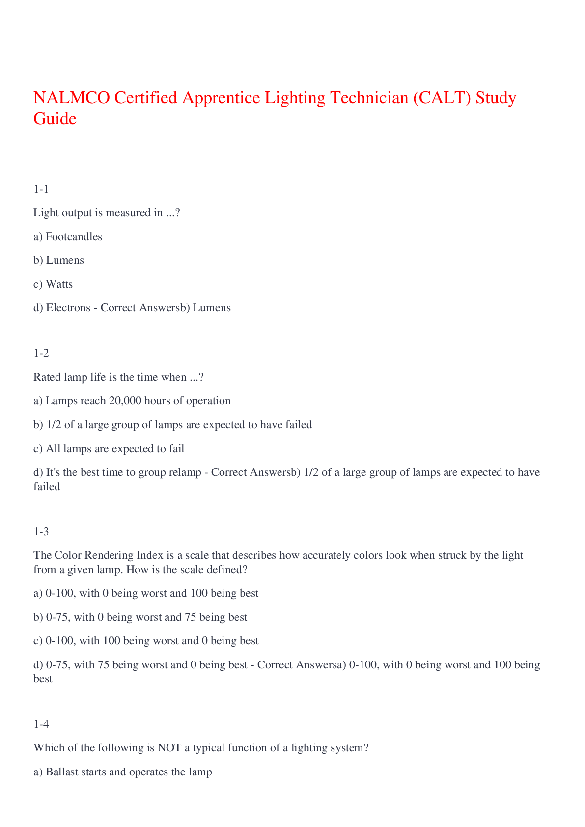 English Language > EXAM > NALMCO Certified Apprentice Lighting Technician (CALT) Study Guide,100% CORRECT (All)