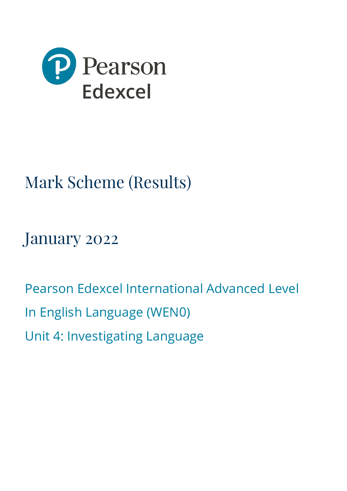 English Language > MARK SCHEMES > Pearson Edexcel International Advanced Level In English Language (WEN0) Unit 4: Investigating Language Mark Scheme (Results) January 2022 (All)