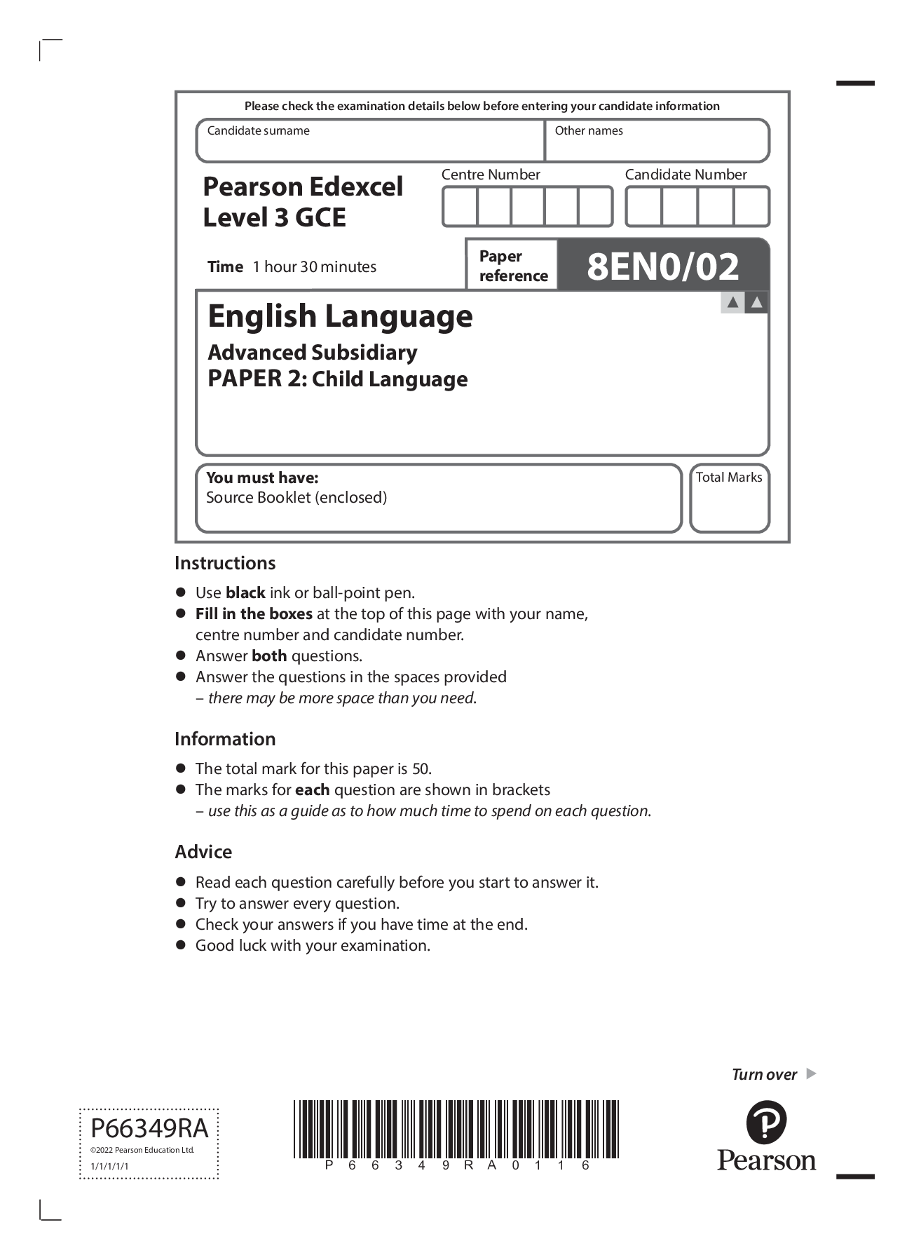 English Language > Edexcel Question Paper > Pearson Edexcel Level 3 GCE English Language Advanced Subsidiary PAPER 2: Child Language 8EN0/02 (All)