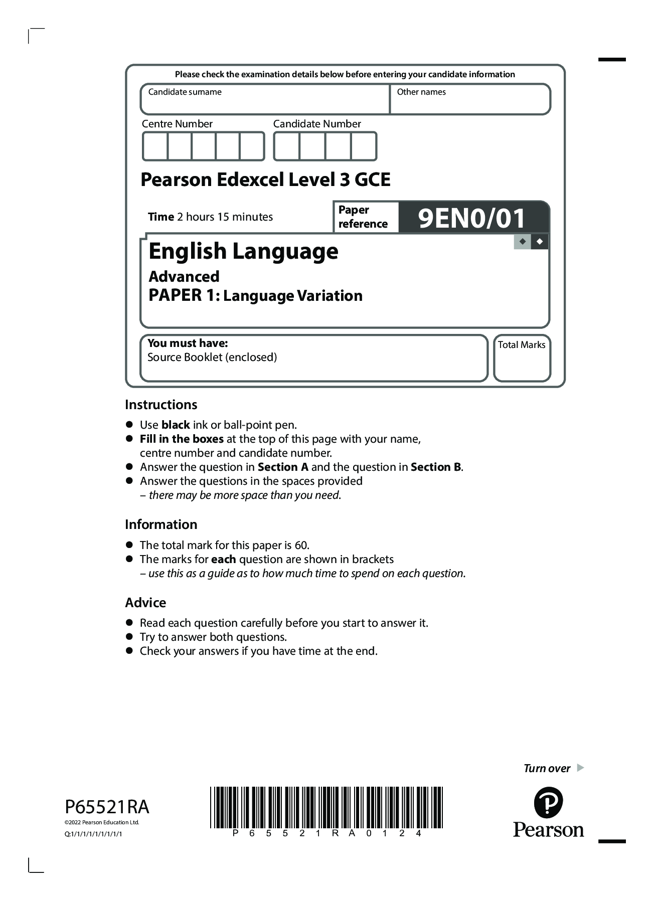 English Language > Edexcel Question Paper > Pearson Edexcel Level 3 GCE English Language Advanced PAPER 1: Language Variation 9EN0/01 (All)