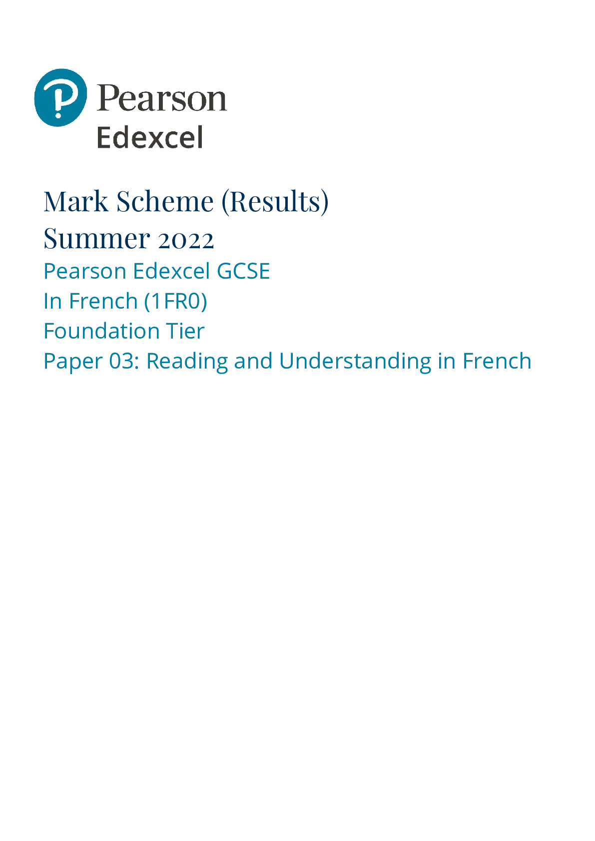 French > MARK SCHEMES > Mark Scheme (Results) Summer 2022 Pearson Edexcel GCSE In French (1FR0) Foundation Tier Paper 03: Reading and Understanding in French Edexcel and BTEC Qualifications (All)