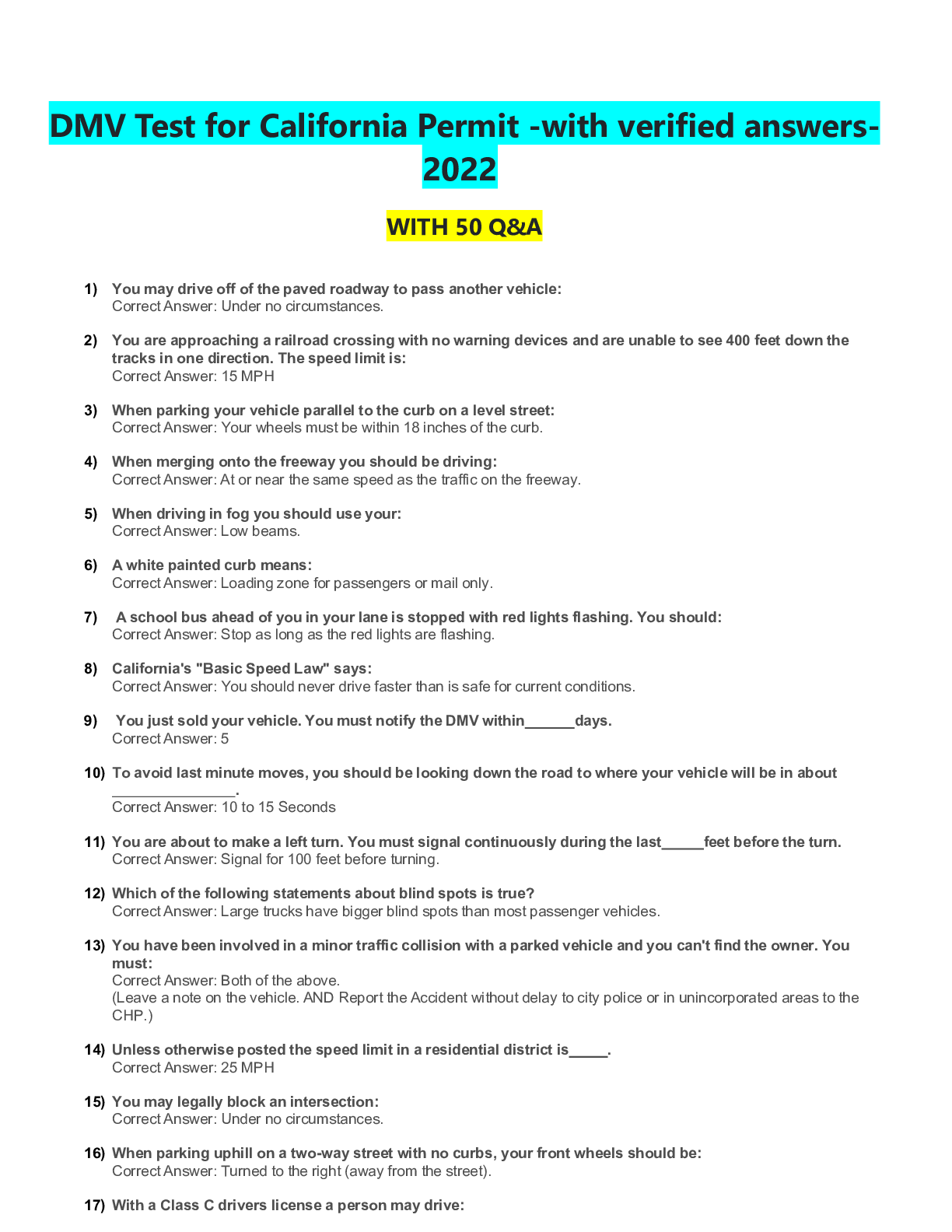 Global Citizenship > EXAM > DMV Test for California Permit -with verified answers-2022 (All)